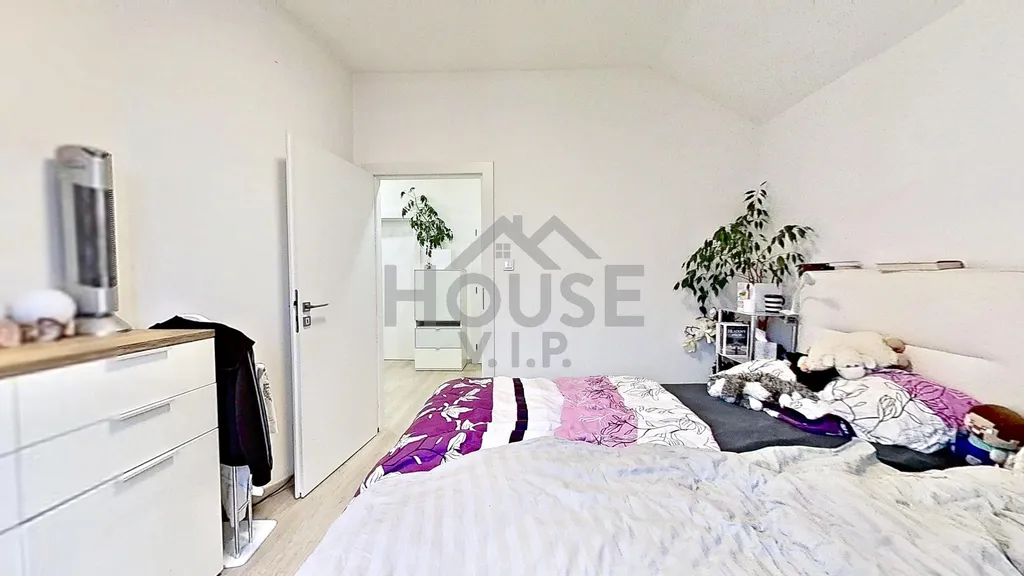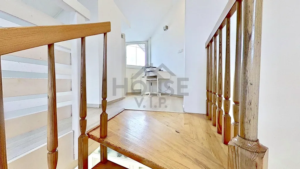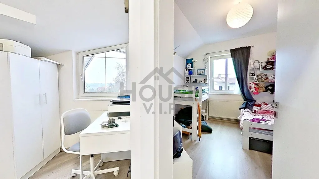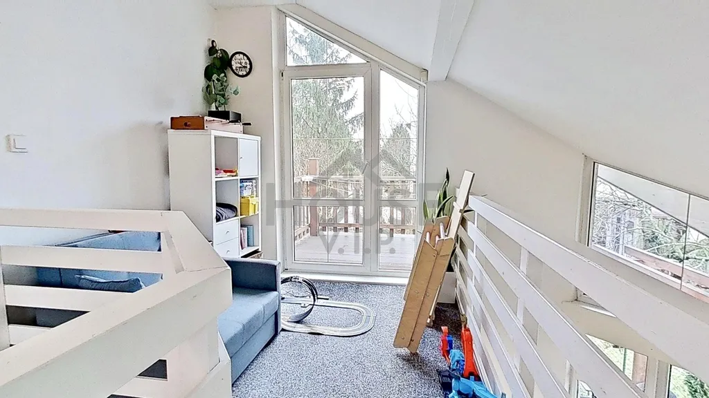 V patře je galerie s relaxační zónou, pracovna, dětský pokoj, ložnice, šatna, prostorná koupelna s vanou a vstup na balkon o ploše 6,67 m² orientovaný na jih.
