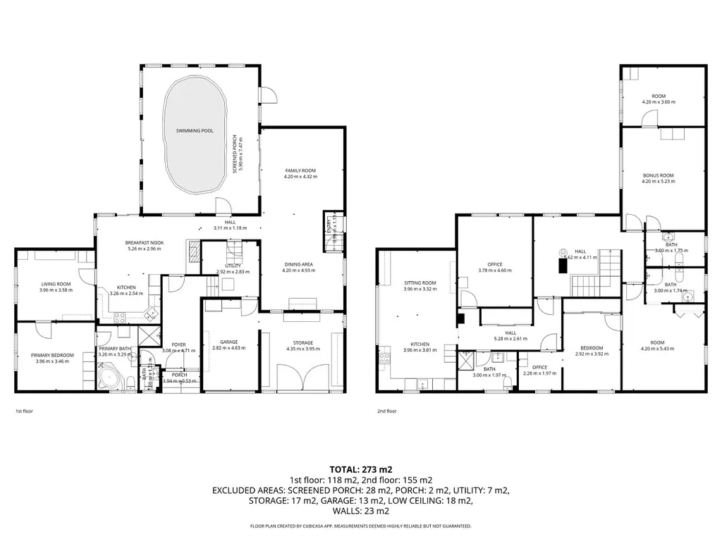 Celková plocha domu činí přibližně 273 m, přičemž první podlaží má cca 118 m a druhé podlaží cca 155 m. Dispozice domu nabízí celkem deset obytných místností, čtyři koupelny s toaletou a jednu samostatnou toaletu. V přízemí se nachází kuchyně, obývací pokoj, jídelna, dva samostatné pokoje, koupelna, samostatné WC, technické zázemí a vstupní hala. Významnou předností této části domu je krytý vyhřívaný bazén, ke kterému je přístup jak přímo z interiéru domu, tak z venkovní terasy. Prostor bazénu je vybaven podlahovým vytápěním a navazuje na samostatnou koupelnu s WC a místnost s infra saunou pro dvě osoby, což vytváří plnohodnotné domácí wellness zázemí.