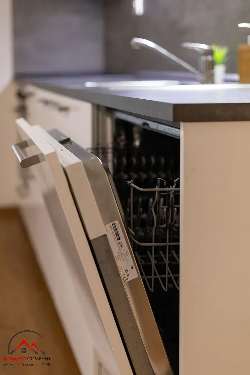 Vybavení bytu zahrnuje kuchyň s elektrickou troubou, myčku, indukční varnou deskou a digestoř. Koupelna je vybavena sprchovým koutem, WC je samostatné.