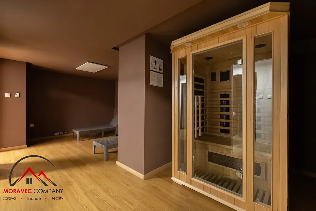 Součástí domu je navíc fitness místnost, wellness a také venkovní krytý bazén.