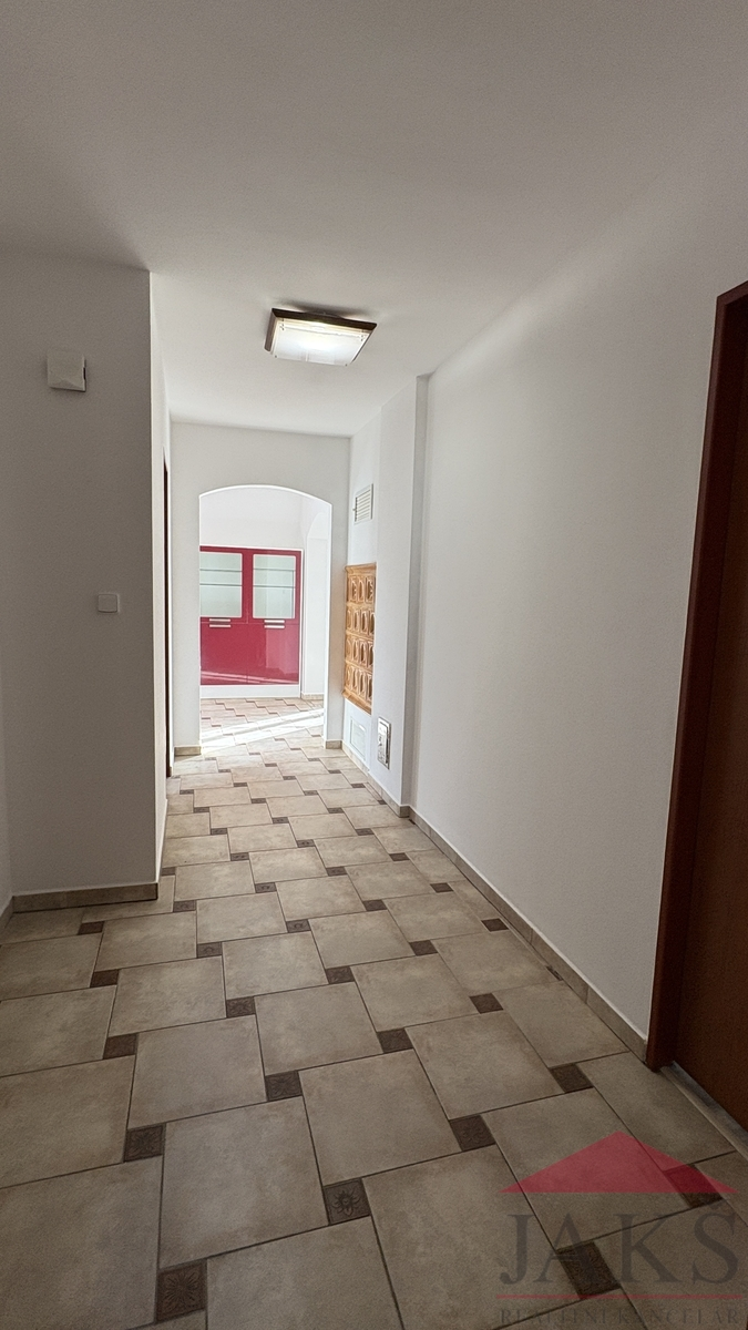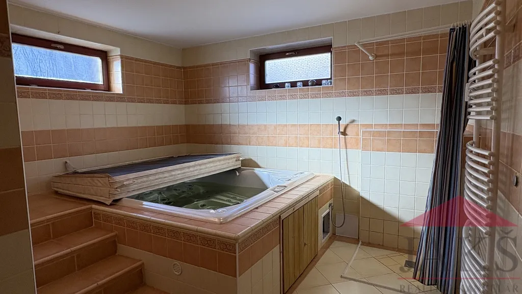 K bytu náleží vlastní suterénní wellness - vířivka Whirpoool, se sprchou a koupelnou (WC a umyv.), skladem a možnost užívání spol. pergoly s venk. krbem s grilem a posezením.