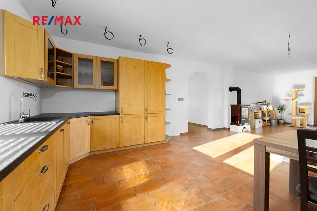 Kuchyně Koryna navazuje na velký obytný prostor s kachlovými kamny a vstupem na krytou terasu.