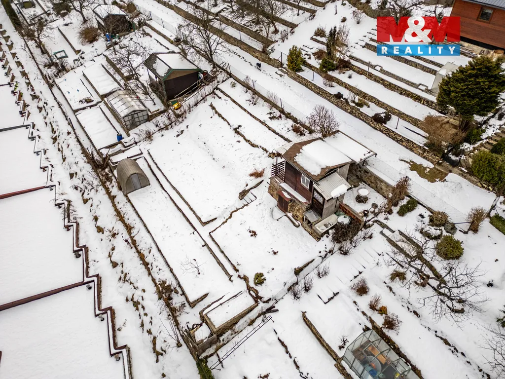 Zahrada je terasovitě řešena do kamenných kaskád a jednotlivé části jsou pohodlně přístupné po nově vybudovaných schodech. Chatka je propojena s nově vydlážděnou terasou se stříškou, která nabízí příjemné místo pro venkovní posezení či grilování.