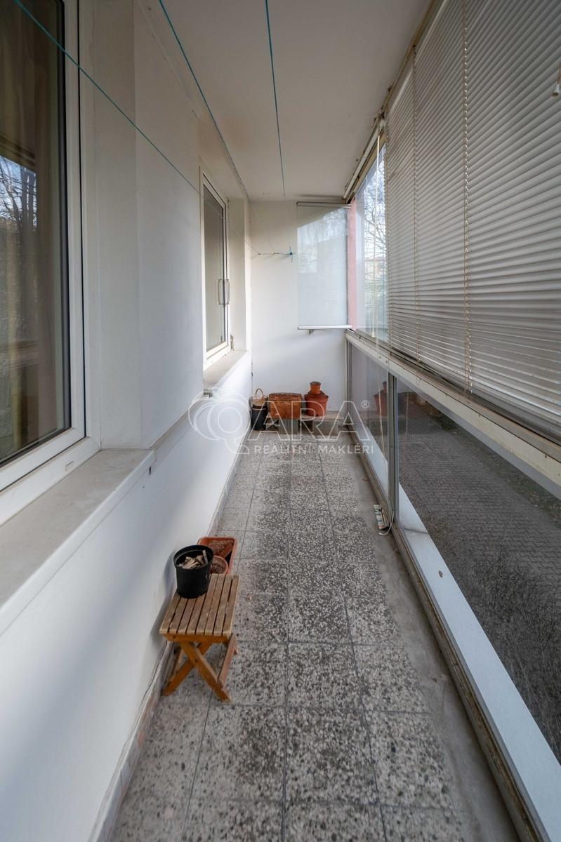 Aktuální dispozice bytu: vstupní chodba, dvě ložnice, obývací pokoj se vstupem na zasklenou lodžii, kuchyně, umakartová koupelna, komora a samostatné WC. K dispozici společná kolárna.