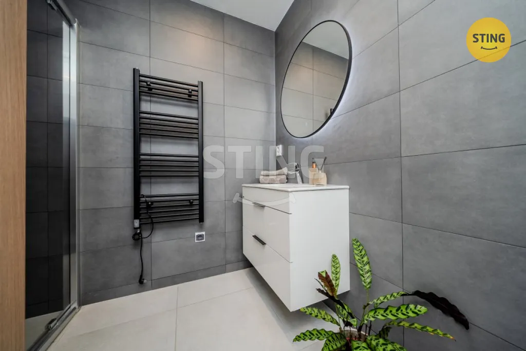 • Koupelna: Moderní design se sprchovým koutem a oknem pro přirozené světlo a větrání. WC je samostatné.