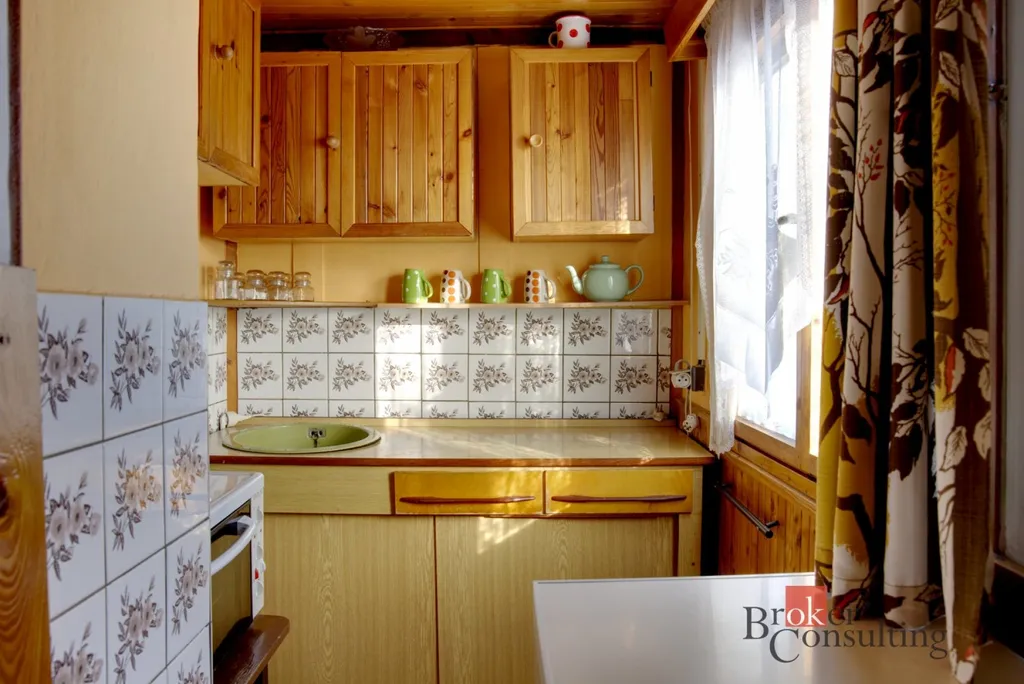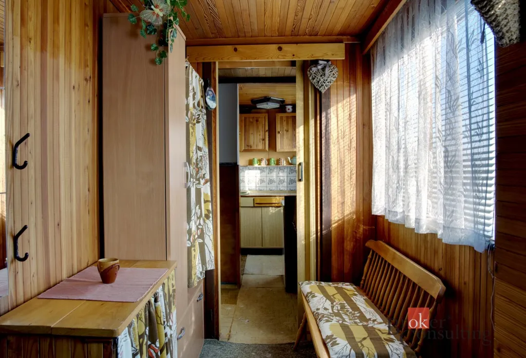 Chata má užitnou plochu cca 38 m² a praktickou dispozici 2 pokoje + kuchyňka. Stavba je postavená na zděných základech, je částečně podsklepená a má sedlovou střechu, což zajišťuje stabilitu i dobré využití prostoru.