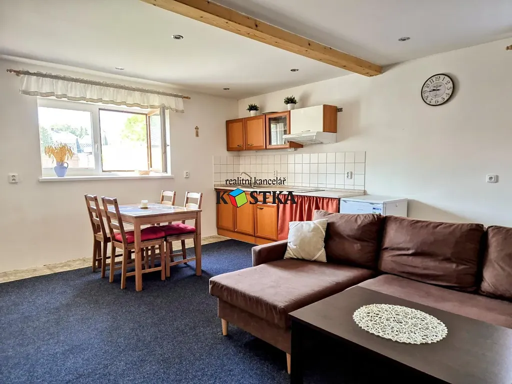 Příjezd k domu je po asfaltové komunikaci, Hned za branou je parkovací místo a malá předzahrádka s možností posezení a prostorem pro hry dětí. Po vstupu do domu je malá vstupní chodba s průchodem na zastřešenou terasu za domem (večerní posezení ve stínu a možná i grilovačka). Po pravé ruce najdete prostor dříve využívaný jako přípravna s malým skladovým prostorem (původně zde majetel provozoval malé podnikání - nový pokoj s příslušenstvím?). Přímo naproti vchodu je toaleta a technická místnost. Nalevo je velký obývací pokoj s kuchyňským koutem a schodištěm do podkroví. Pod střechou jsou dvě velké ložnice, mezi nimi společný prostor. A nakonec je v podkroví prostorná koupelna se sprchovým koutem, umyvadlem a toaletou. Na pozemku před domem je skladovací prostor využívaný jako kolárna.