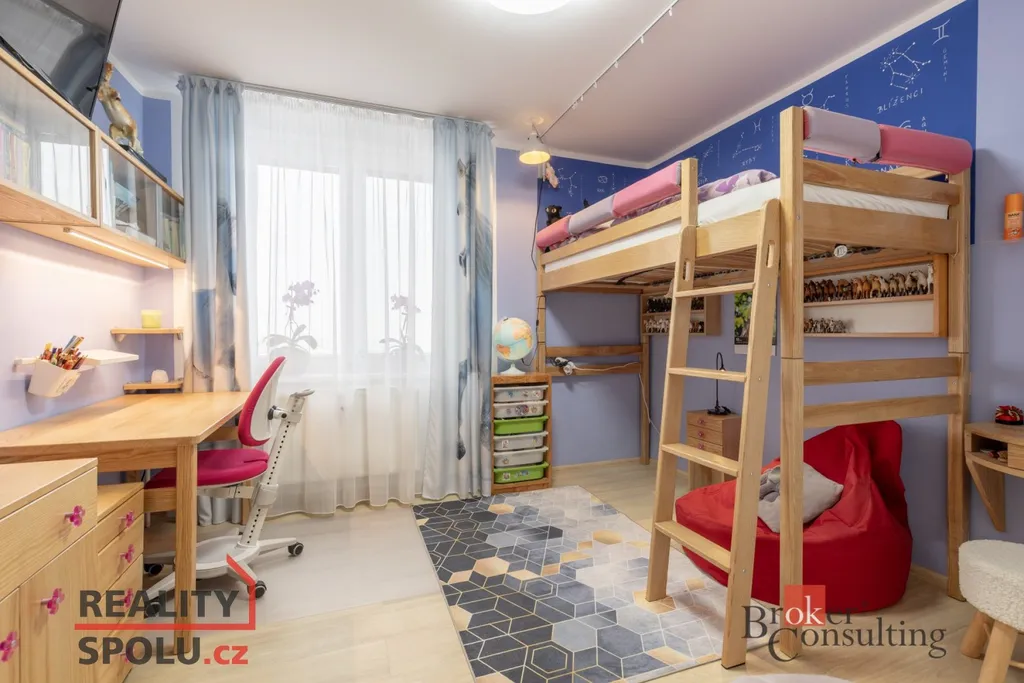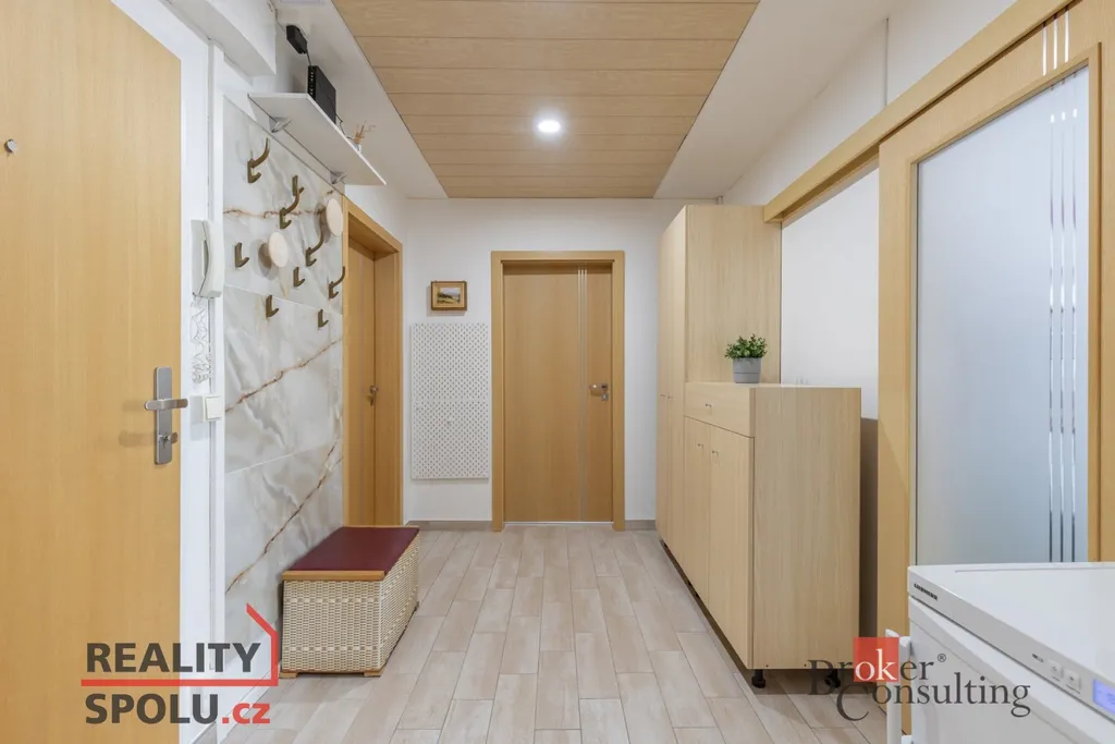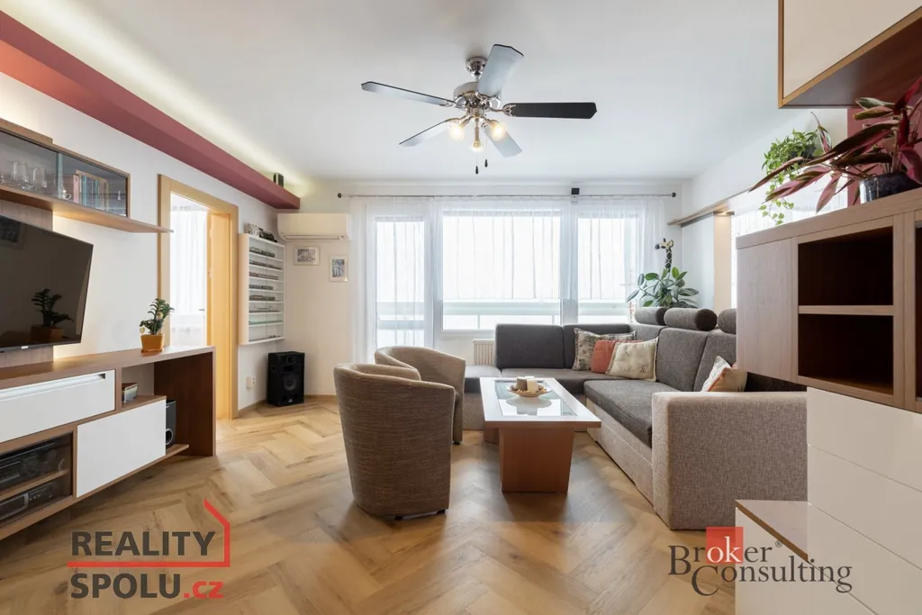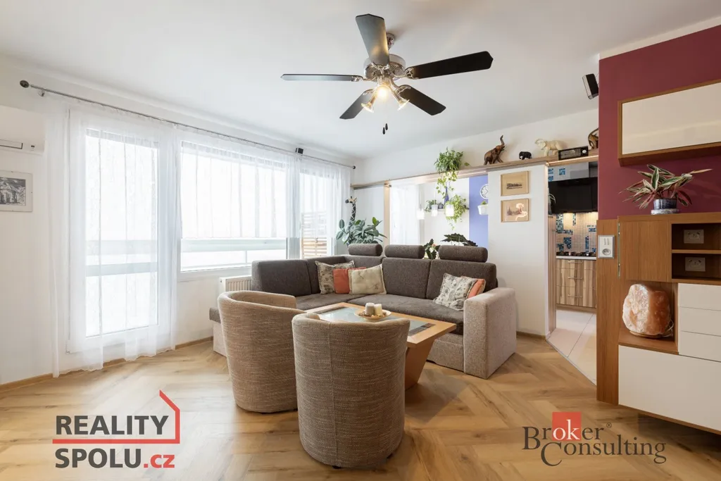 Byt vás přivítá prostornou vstupní chodbou, která působí vzdušně a nabízí dostatek místa pro uložení věcí. Dominantou bytu je prostorný obývací pokoj s nábytkem na míru a klimatizací, odkud je přímý vstup na balkon se zaskleným posuvným systémem. Obývací pokoj je průchozí do prvního pokoje, který je v současnosti využíván jako ložnice. Obývací část je propojena s kuchyní a jídelním koutem. Původní příčka byla odstraněna a prostor dnes citlivě rozděluje prvek v podobě sloupu a částečně zachované horní části stěny, která vyvolává pocit oddělení a zároveň ponechává interiér otevřený. Kuchyně je moderní, kompaktní a prakticky řešená, ideální pro každodenní vaření. Byt dále nabízí další dva samostatné pokoje – jeden o velikosti 12.25 m², ideální jako dětský pokoj či pracovna, a druhý o velikosti 9 m², který nabízí plnohodnotný prostor s variabilním využitím. Předností bytu jsou vestavěné skříně, které jsou v každém pokoji. V bytě je dále samostatné WC a koupelna doplněná o podhled s nastavitelným LED osvětlením, které umožňuje navodit příjemnou atmosféru pro chvíle relaxace.