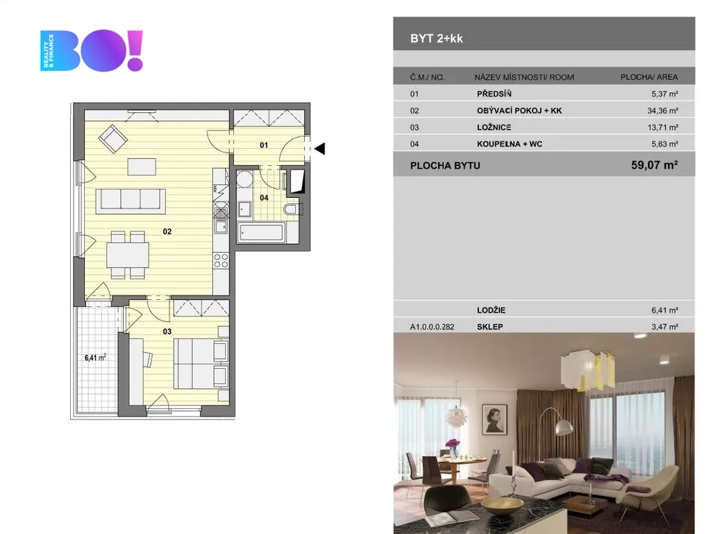 2+kk podlahová plocha 59 m² + lodžie 6 m².