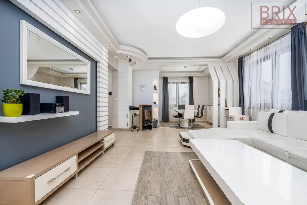 Nabízíme k prodeji krásný a moderní rodinný dům o dispozici 7+kk a celkovou plochou 404 m2. 1. NP 105 m2, 2. NP 99 m2, 1. PP 107 m2. V domě Vás na první pohled zaujme velký obývací pokoj s jídelnou a kuchyňským koutem s krásnými designovými podhledy a stěnou, propracované osvětlení a HS portál, skrz který vstoupíte na zastřešenou a krytou terasu o 19 m2, která Vám rozšíří obývací pokoj a na kterou navazuje druhá terasa o 29 m2. Orientaci mají na jih, takže je můžete využívat větší část roku. Rodinnou atmosféru a pohodu Vám zde navodí zase krbová kamna. Dále zde najdete dva samostatné velké pokoje a velkou koupelnu se sprchovým koutem, dvěma umyvadly a toaletou. Tyto pokoje jdou oddělit posuvnými dveřmi a využívat dům jako dvougenerační. U vstupu je také samostatná toaleta. V patře najdete tři samostatné pokoje, koupelnu a velkou hlavní ložnici s šatnou a vlastní koupelnou. Na koupelnu navazuje vlastní balkon o 3 m2. Dva pokoje jsou zde propojené přes zimní zahradu, na kterou navazuje balkon o 6 m2 s krásným výhledem. V 1. PP Vás jistě zaujme vlastní posilovna, společenská místnost pro Vaše párty, místnost s vířivkou, technická místnost a dva sklady. Prostor u schodiště se nabízí např. na zřízení knihovny. Dům je vytápěný plynovým kondenzačním kotlem pomocí podlahového vytápění. Díky FVE s bateriemi ušetříte za elektřinu a můžete si ze sluníčka také nabít auto. Zahradu si jistě zamilujete díky krásnému trávníku a okrasným stromkům a keřům. Je zde také automatická závlaha. V samostatné garáži o 19 m2 zaparkujete až 3 auta. Jedno uvnitř a až dvě pod přístřeškem o 17 m2. Nenechte si utéct tuto skvělou nabídku a přijďte se podívat na prohlídku.