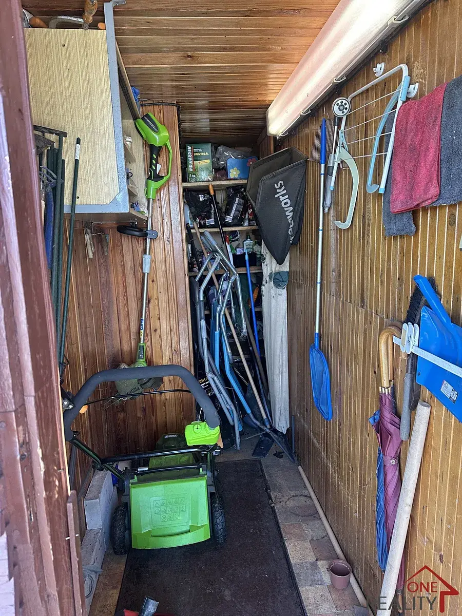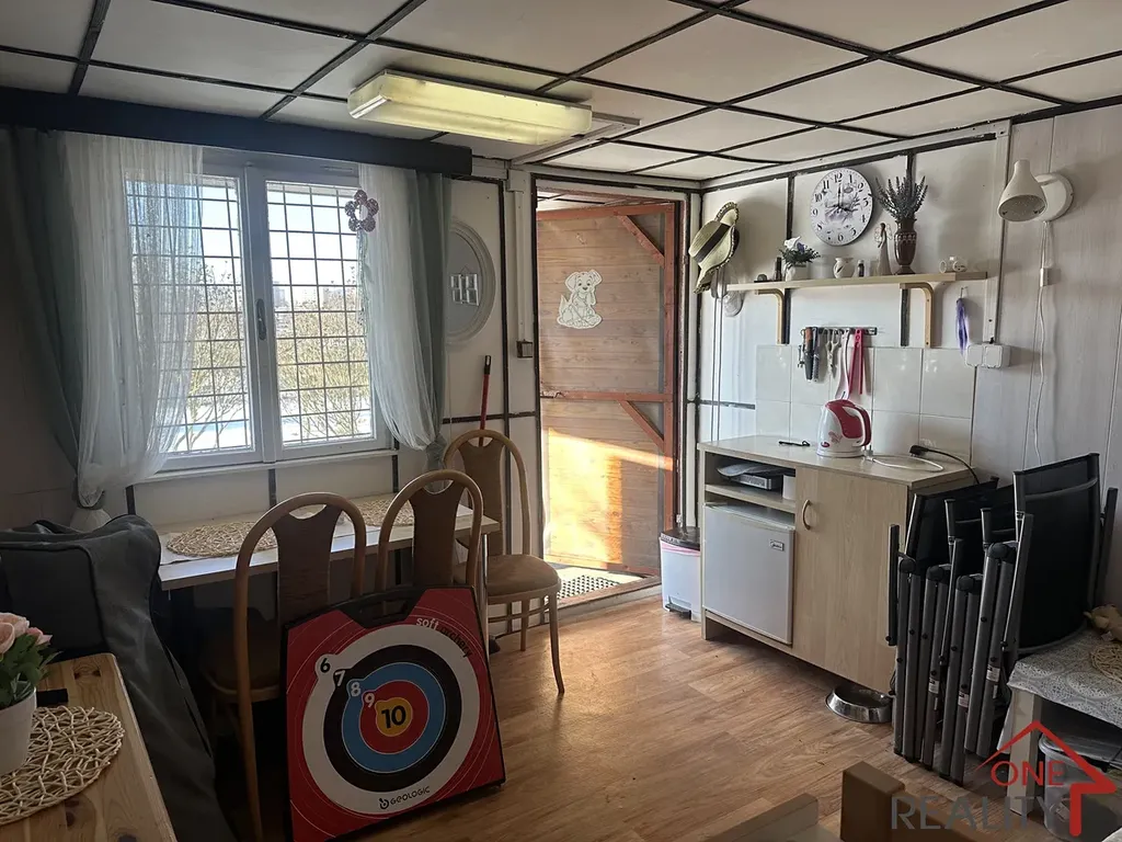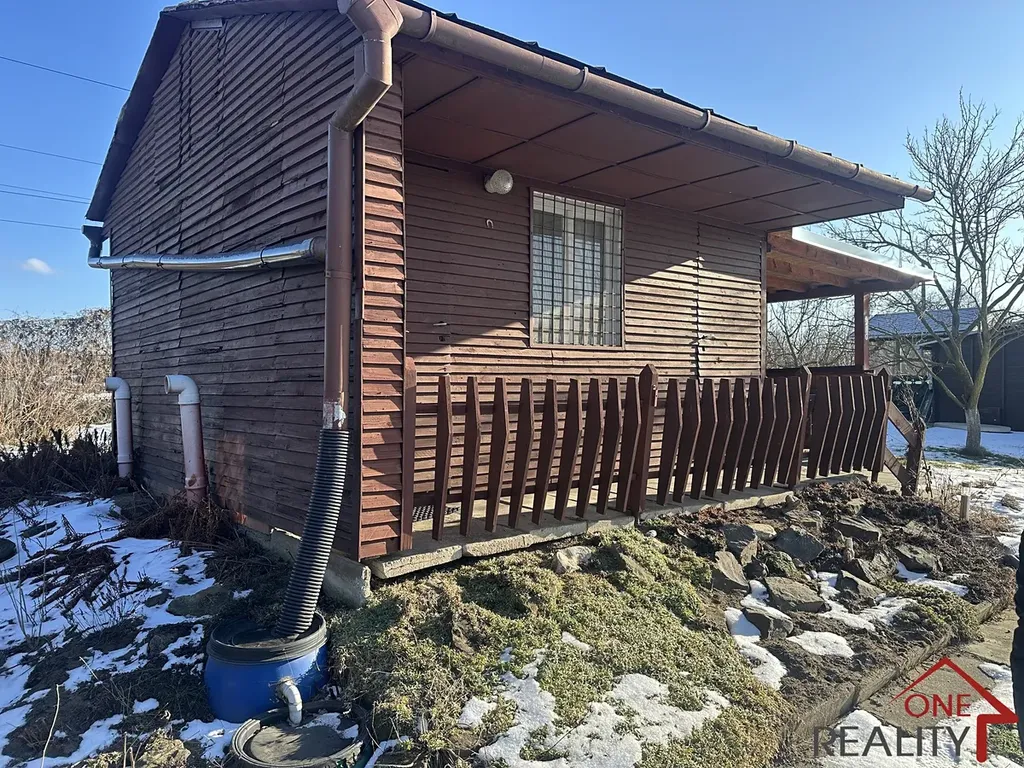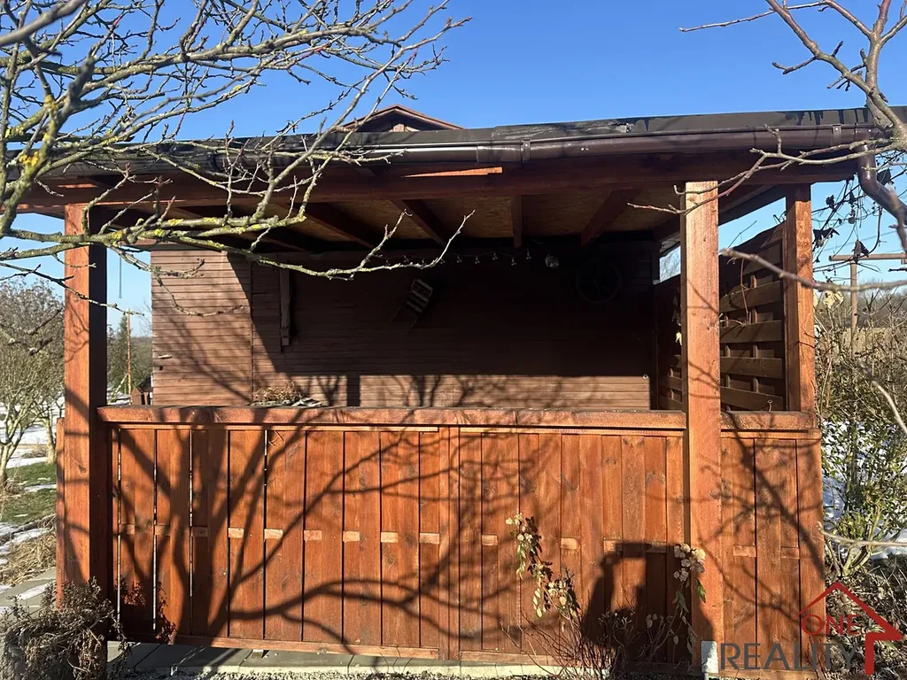 Na zahradě stojí podsklepená, dřevěná chata s novou pergolou. V chatě o velikosti cca 22m2 je elektřina a připojka na vodovodní řád. Na zahradě je přívod užitné vody.