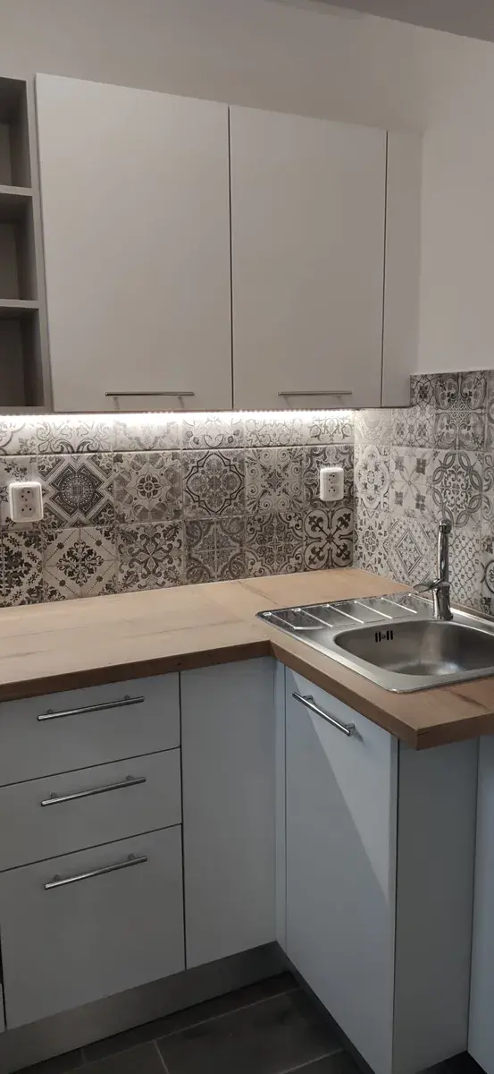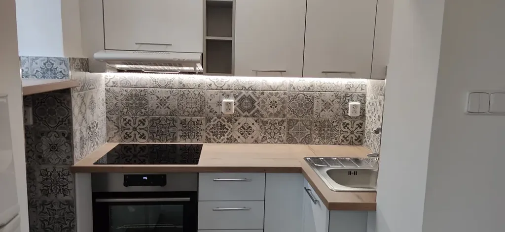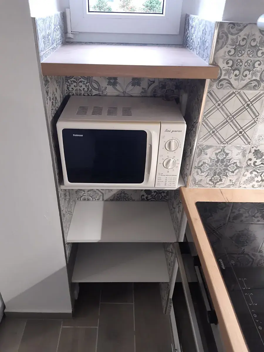V kuchyňském koutě vestavěná linka, sklokeramická varná deska, trouba, lednice, mikrovlnná trouba. Velká okna vedou do klidné zahrady. Mobilní klimatizace. Podlahy - dlažba. Topení WAW.
