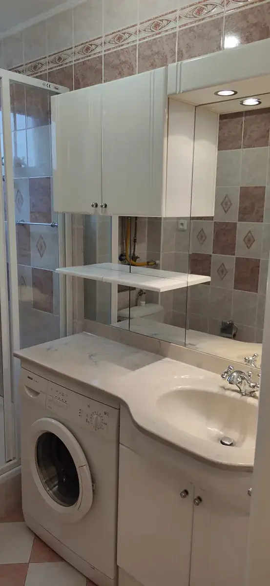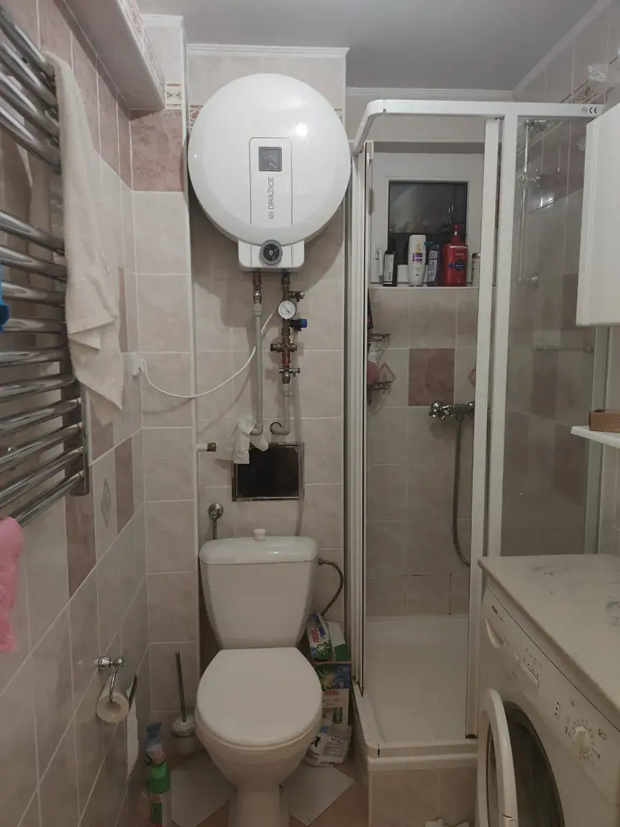 V koupelně sprchový kout, umyvadlo, pračka, bojler na ohřev vody, topný žebřík. V předsíni šatní skříň, botník, vysavač. Nové vstupní dveře s protihlukovou úpravou.