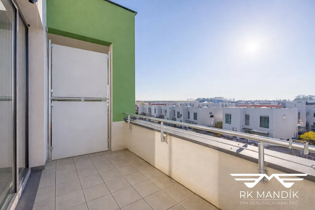 Byt je dispozičně řešen obývacím pokojem s kuchyňským koutem, ze kterého je vstup na balkon (5,9 m²), chodbou s úložným prostorem a komorou. Dále je možné využít parkovací stání umístěné v podzemním podlaží.