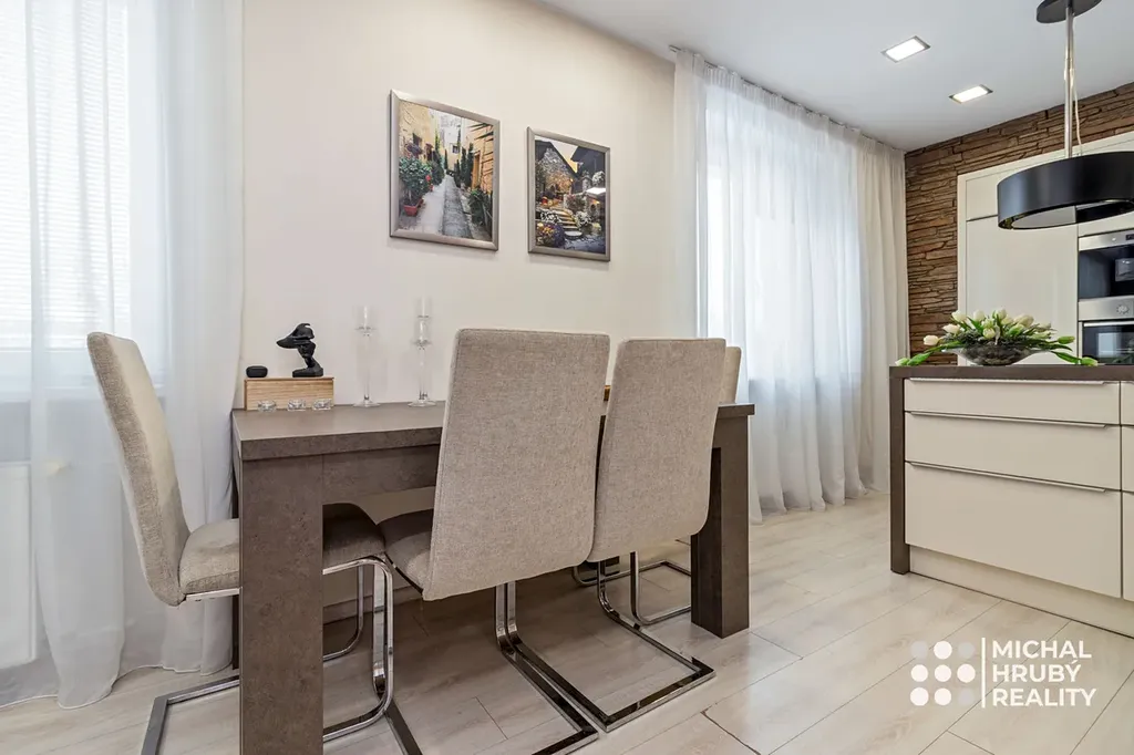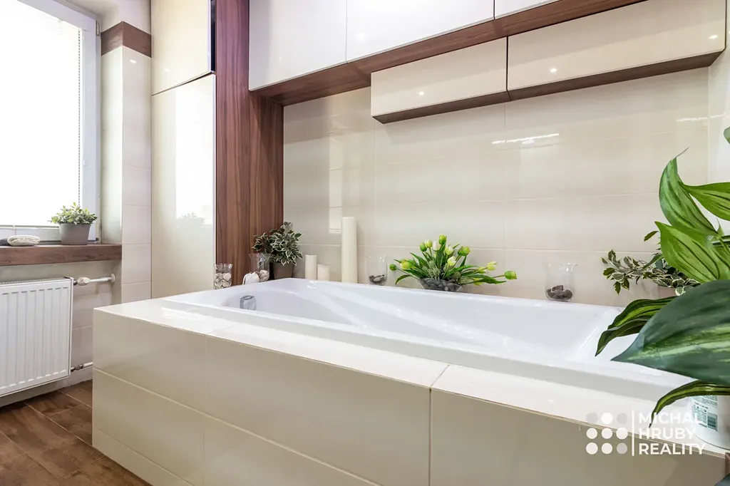 Například dominantní obývací pokoj spojen s kuchyní, která stylově zapadá do konceptu celého bytu. Spotřebiče zabudované stylově přímo do stěny spolu s praktickou spíží. Nebo koupelnu, která je jednou z nejhezčích, jakou jsem kdy v bytě viděl. Vznikla z původního pokoje, takže je nadstandardně velké, najdete v ní vanu i sprchový kout, vše opět ve vysokém standardu.