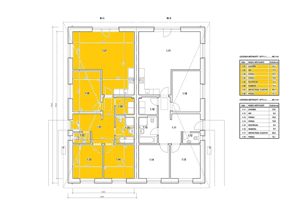 Bytové jednotky v RD budou dispozičně navržené jako 4+kk, užitná plocha 90 m2 ( výměry je možné ještě upravit ).