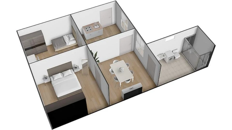 Z kuchyně je vstup do prvního samostatného pokoje o celkové výměře cca 15,51 m², který lze vyžít jako obývací pokoj či ložnici. Dále se z kuchyně dostaneme do průchozího pokoje o celkové výměře cca 11,88 m², který je rovněž orientován do klidného dvora a nabízí příjemné soukromí.