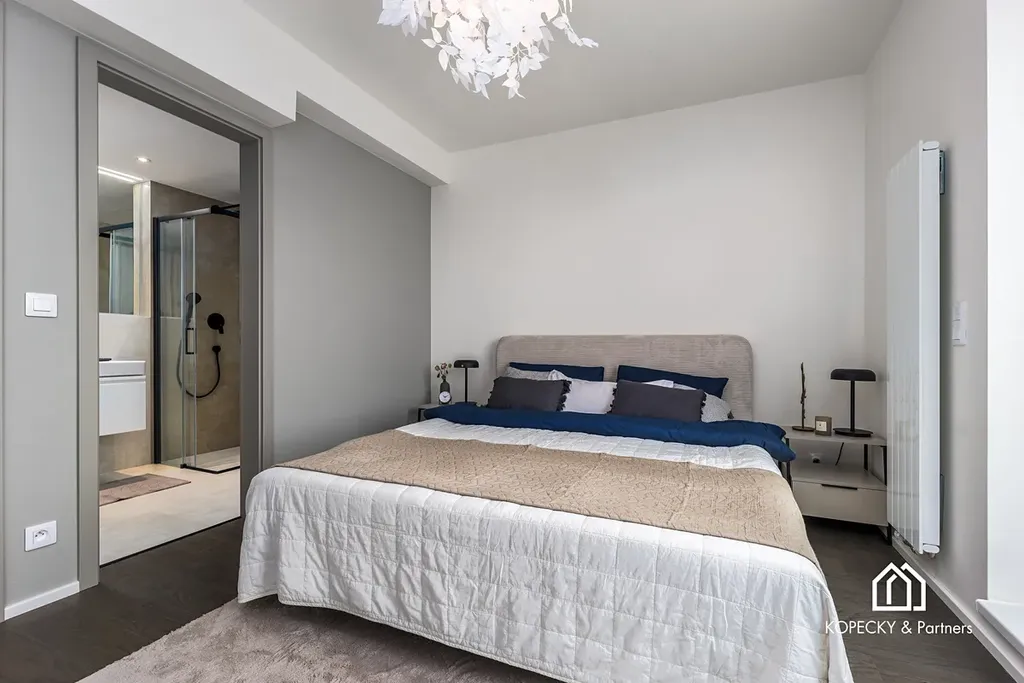Byt o užitné ploše 119 m² je navržen tak, aby splňoval náročné požadavky na pohodlí i praktičnost. Hlavní obytnou část tvoří světlý obývací pokoj s kuchyňským koutem o rozloze téměř 30 m², který je díky velkým francouzským oknům příjemně prosvětlen a nabízí dostatek prostoru pro rodinné posezení nebo setkání s přáteli. Nechybí zde tři prostorné ložnice a další samostatná místnost, kterou lze využít jako pracovnu, dětský pokoj či pokoj pro hosty.
