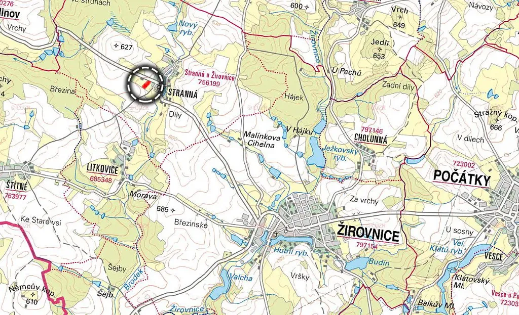 Pozemky jsou zapsány na listu vlastnictví 911 pod čísly parcel 993/1, 993/2, 994/1 a 994/2 v katastrálním území Stranná u Žirovnice. Ve stavební ploše leží konkrétně pozemky 993/1 a 994/1 a to asi z jedné - přední -poloviny. Ve zbytku výměry jsou pozemky označeny jako zeleň, tedy zahrada nebo sad. Plocha je zakončena porostem poskytujícím soukromí a oddělující zemědělskou půdu. Ze severní strany přiléhají k parcelám v obecním vlastnictví, bude tak možné napojení přístupové cesty.