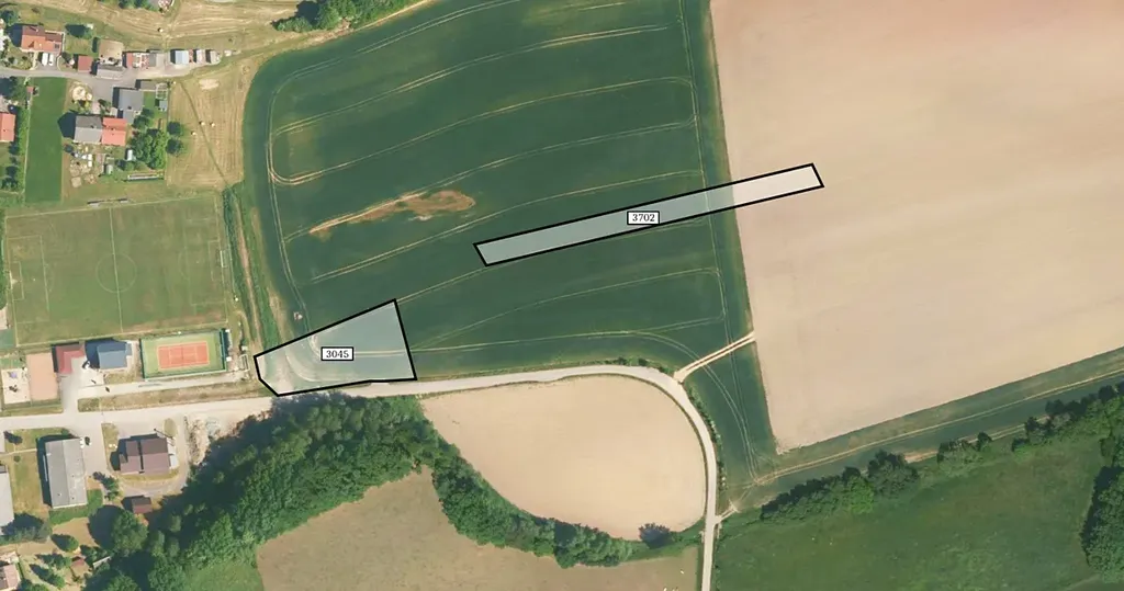 Parcely jsou zapsány na listu vlastnictví 643 pod čísly 3045 a 3702. Parcela blíže obci, číslo 3045, leží ve stavební ploše téměř celou svou výměrou, pouze několik m2 zasahuje do plochy veřejného prostranství. Druhá z parcel je ve ploše bydlení více než z poloviny. Přesné umístění je zřejmé z přiložených fotografií.