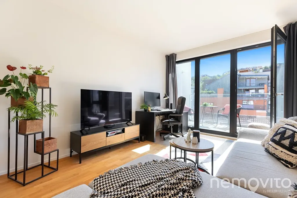 Díky velké ploše je velikost obýváku skutečně velkorysá. 39 m2 poskytuje dostatek prostoru pro plnohodnotnou jídelnu, která navazuje na kuchyni do tvaru U, ke které pod schody náleží také spižírna. V části pro pohovku či pracovnu je pak výstup na 5 m2 balkon s orientací na jih, tedy směrem na Šmukýřku. Díky orientaci na odvrácenou stranu od vytížených tahů je tak v bytě skutečně klid. Velkoformátová okna zajišťují vysokou míru proslunění, které lze však regulovat venkovními žaluziemi.