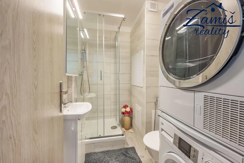 Nově zrekonstuovaná koupelna se skleněným sprchovým koutem, umyvadlem a prostorem pro pračku.