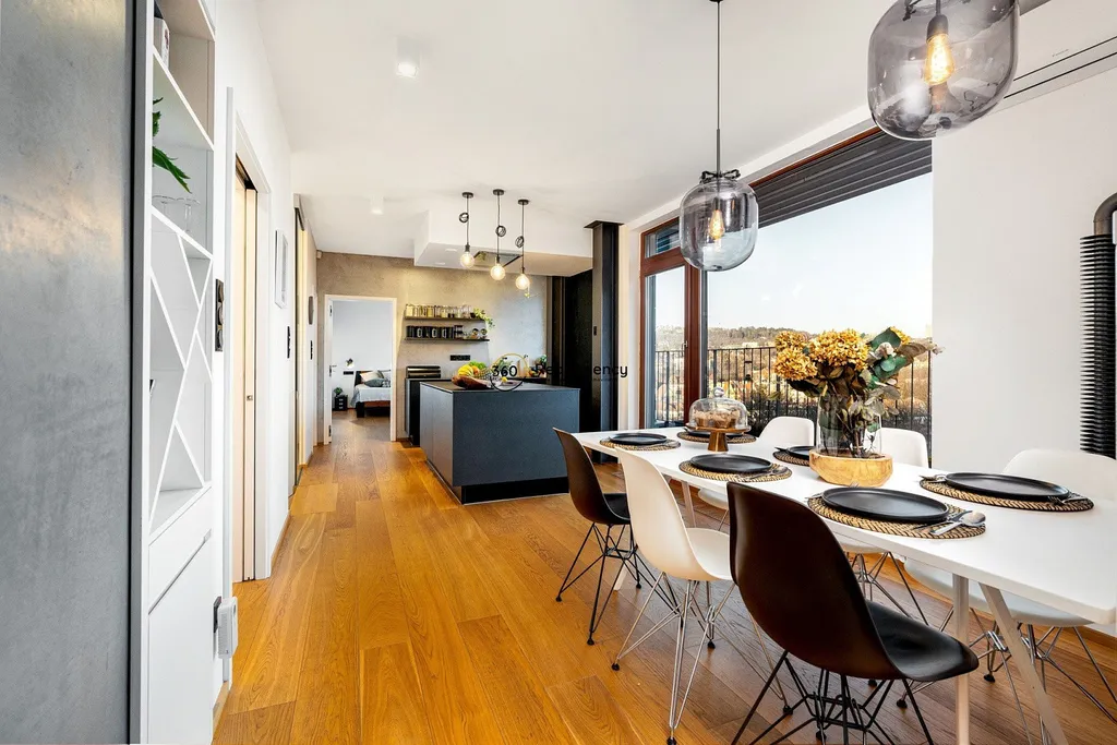 Horní patro tvoří hlavní obytný prostor bytu – prostorný a světlý obývací pokoj s kuchyní, hlavní ložnice s vlastní koupelnou a samostatná toaleta umístěná hned u vstupu do bytu. Celý prostor působí velmi vzdušně a příjemně díky velkým oknům a otevřenému řešení. Z této úrovně je přístup na terasy, které přirozeně rozšiřují obytnou plochu a umožňují každodenní pobyt venku.