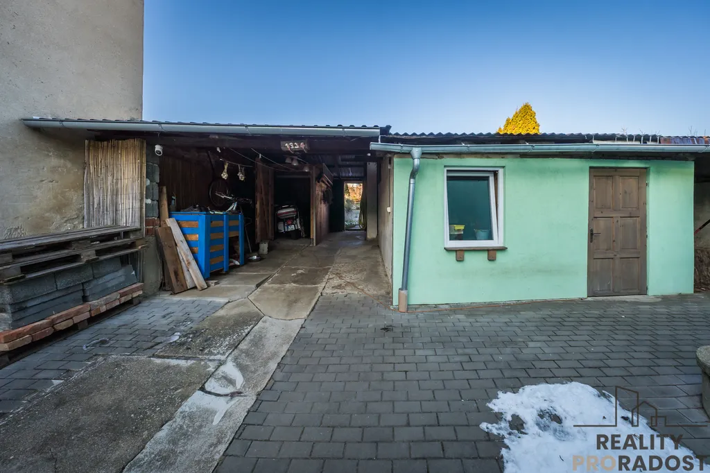 Na uzavřeném dvoře, je k dispozici stání pro 2 auta, studna s užitkovou vodou a dílna. Na zahradě se nachází posezení a kvelbený sklep, kde je možné vychutnávat klid a pohodu, neboť zahrada nabízí prostor pro relaxaci a zahradničení. Přístup na zahradu je možné i ze zední strany pozemku.