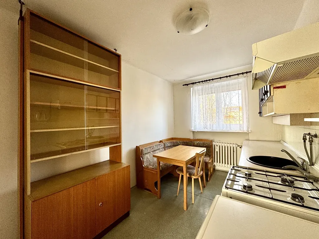 Byt je v původním stavu a skládá se z předsíně, odděleně řešené koupelny a toalety, kuchyně, obývacího pokoje a ložnice. Z chodby je přístup do kuchyně a obývacího pokoje. Do ložnice je přístup z kuchyně nebo obývacího pokoje. Z obývacího pokoje se dostanete na balkon. V kuchyni je linka s plynovým sporákem. Okna v bytě jsou plastová. K bytu také patří sklepní kóje (2 m2). Sousedé a celkově vchod je klidný a čistý.