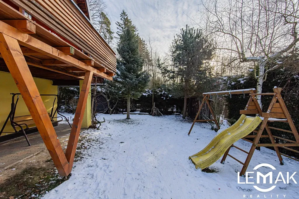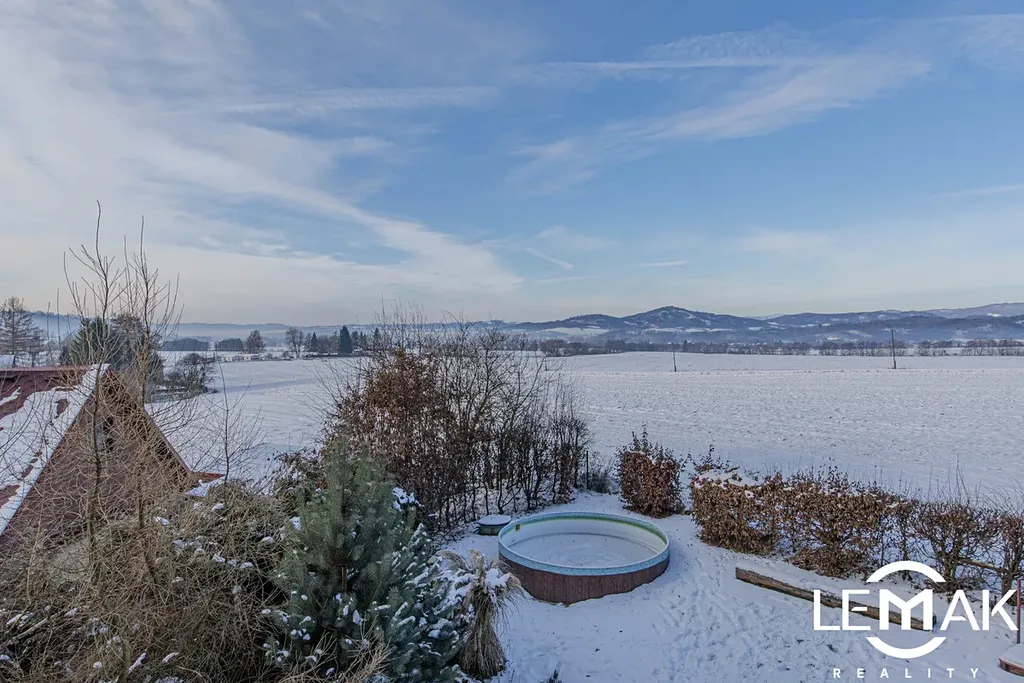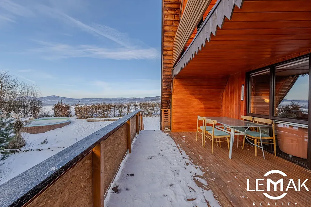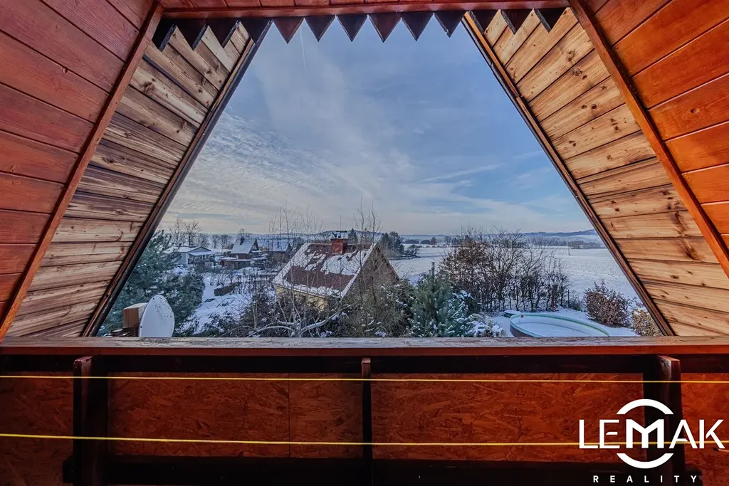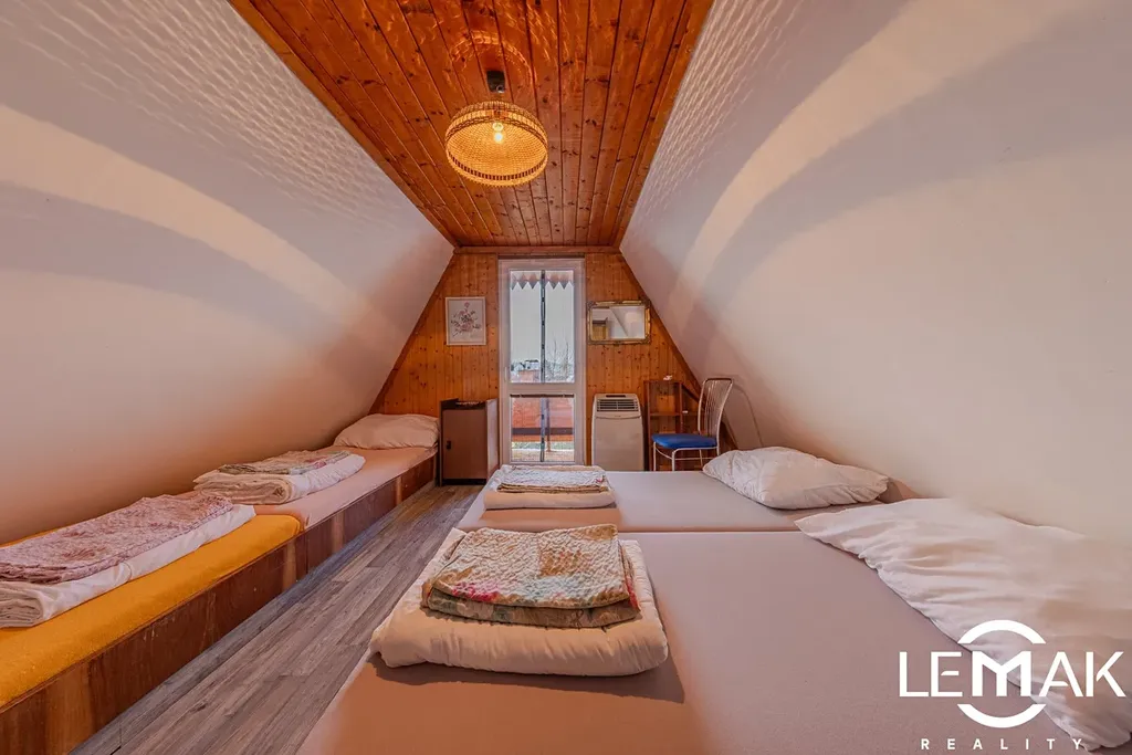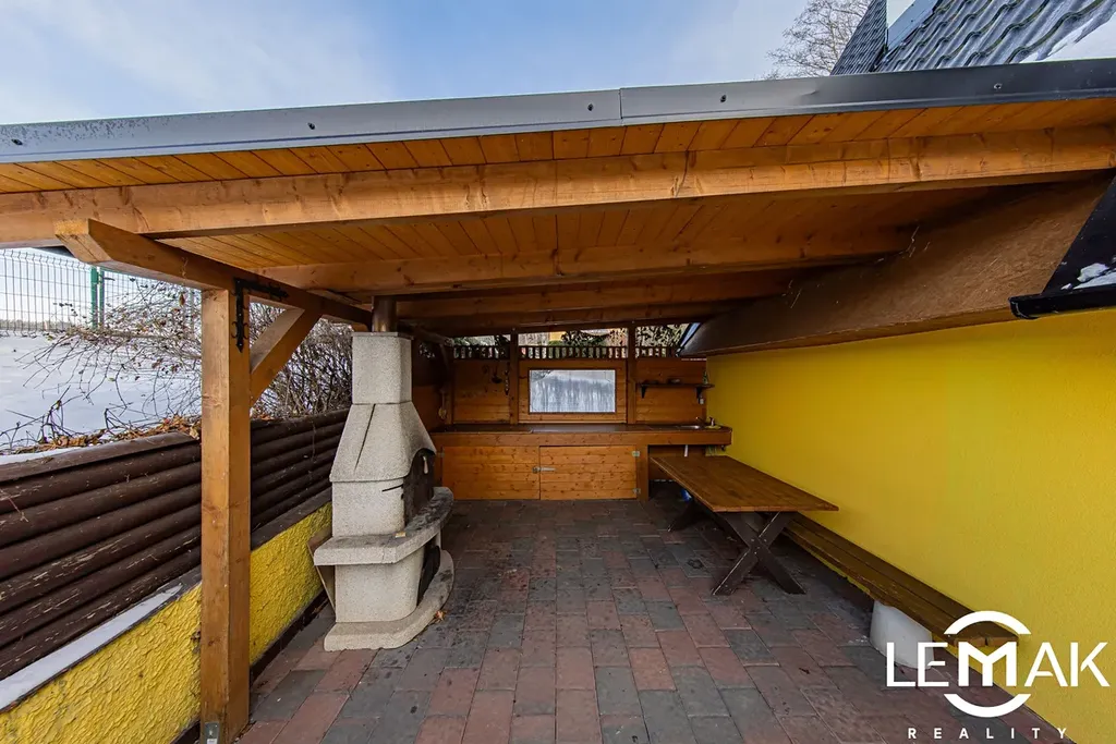 Podkroví nabízí dva samostatné pokoje, z nichž jeden má balkon s pěkným výhledem do okolní krajiny. Venkovní zázemí doplňuje grilovací přístřešek a částečně zastřešená venkovní kuchyně se zavedenou vodou, ideální pro letní posezení s rodinou nebo hosty.