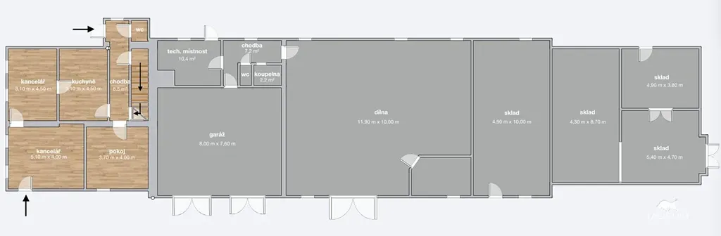 Komerční prostory o výměře přes 300 m2 tvoří 2 dílny s vlastním sociálním zázemím a velký skladový prostor. 1 z dílen je aktuálně pronajímána jako autoservis, druhá nabízí stejný potenciál nebo jiné podnikatelské využití. Nad dílnou a skladem se nachází půda.