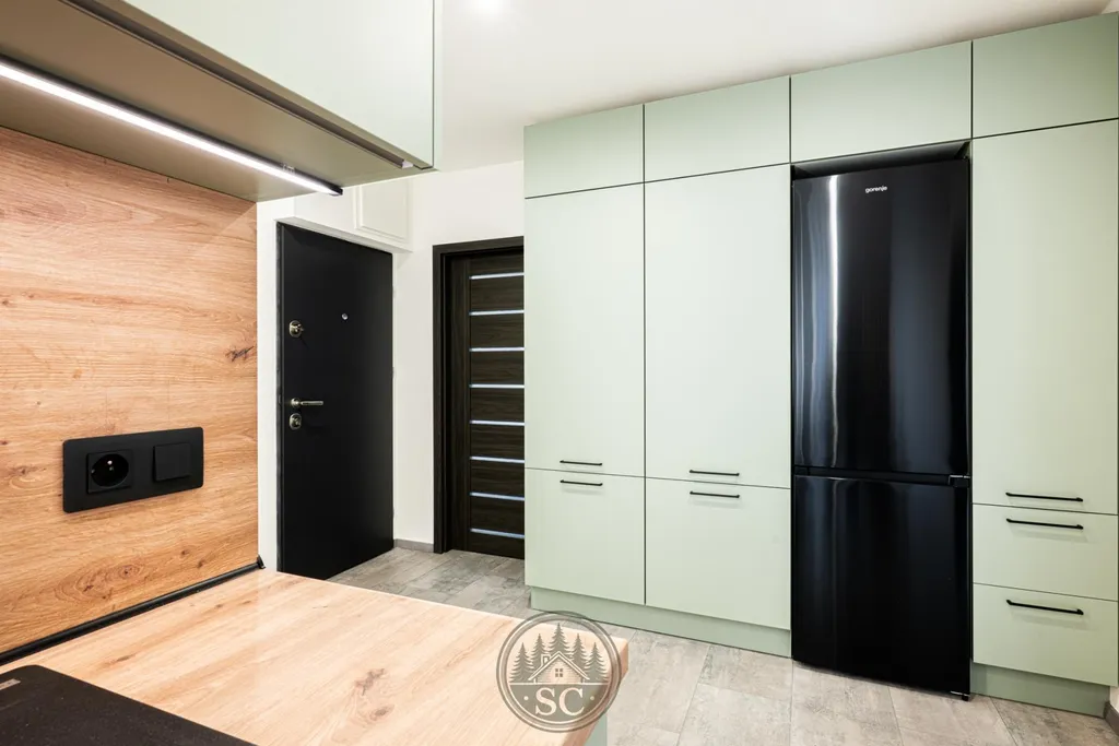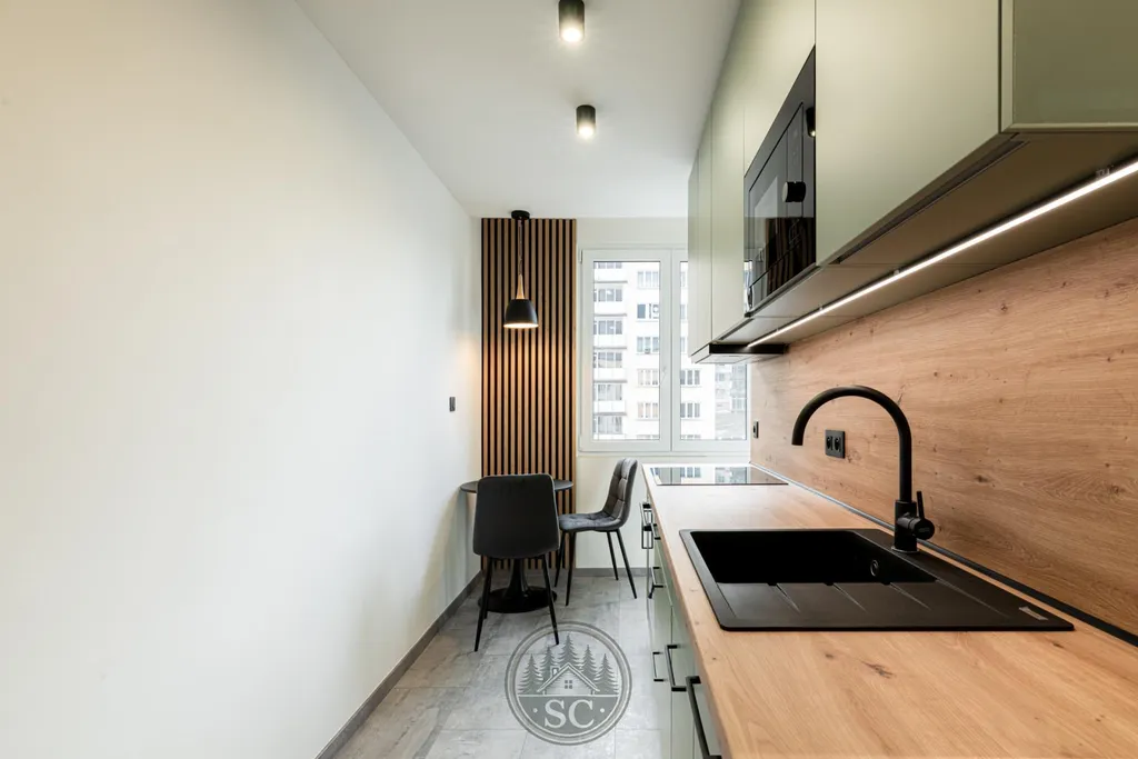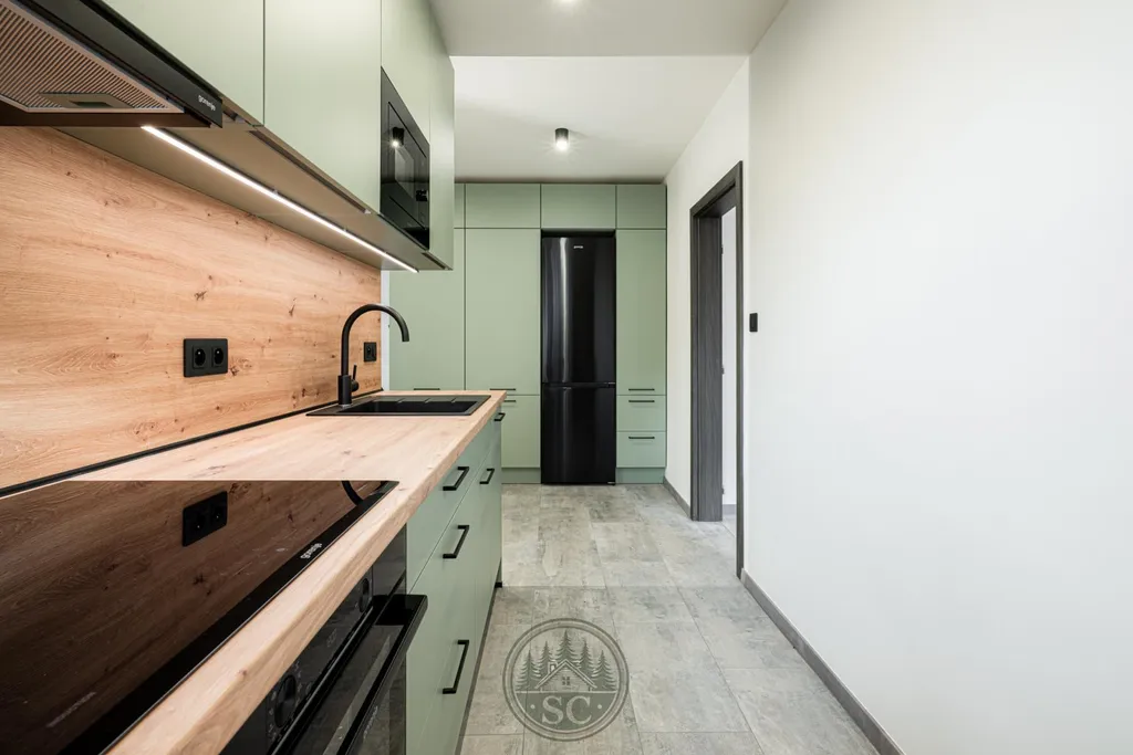 Dominantou bytu je kuchyňská linka vyrobená na míru, která maximálně využívá prostor. V kuchyňském koutě vznikl citlivě a elegantně oddělený prostor pro pračku a sušičku, navržený tak, aby přirozeně zapadal do celkového řešení bytu a nerušil vzhled interiéru. Kuchyňská linka, prací kout a vestavná skříň na chodbě jsou sladěny do jednotného designu v jemném zeleném odstínu, který bytu dodává osobitý a nadstandardní charakter.