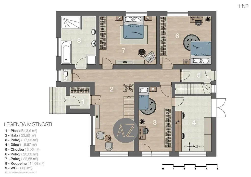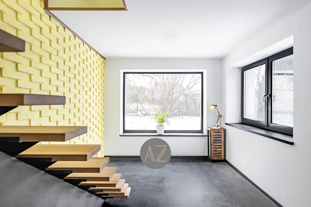 V přízemí domu najdete 3 pokoje s koupelnou a WC a další místnost s využitím např. jako dílna, fitness nebo wellness. Výjimečným designovým prvkem je zde schodiště z ušlechtilého kovu v kombinaci s dubovým dřevem, po jehož pravé straně jsou na stěně přiznané původní cihly, které byly natřeny na žluto, aby dodávaly domu světelnou pohodu a pocit slunečního světla za každého počasí.