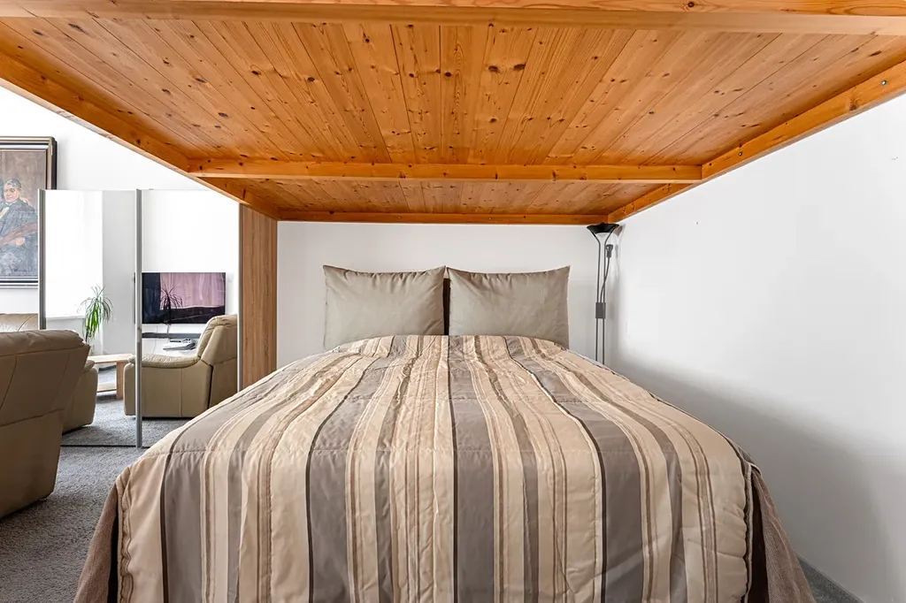 Byt sestává z otevřené předsíně spolu s kuchyní (vestavné spotřebiče - varná deska, digestoř, trouba, myčka, pračka), 2x pokojů a koupelny s vanou a WC. V jednom pokoji je praktické patro na spaní. Více na přiloženém půdorysu.