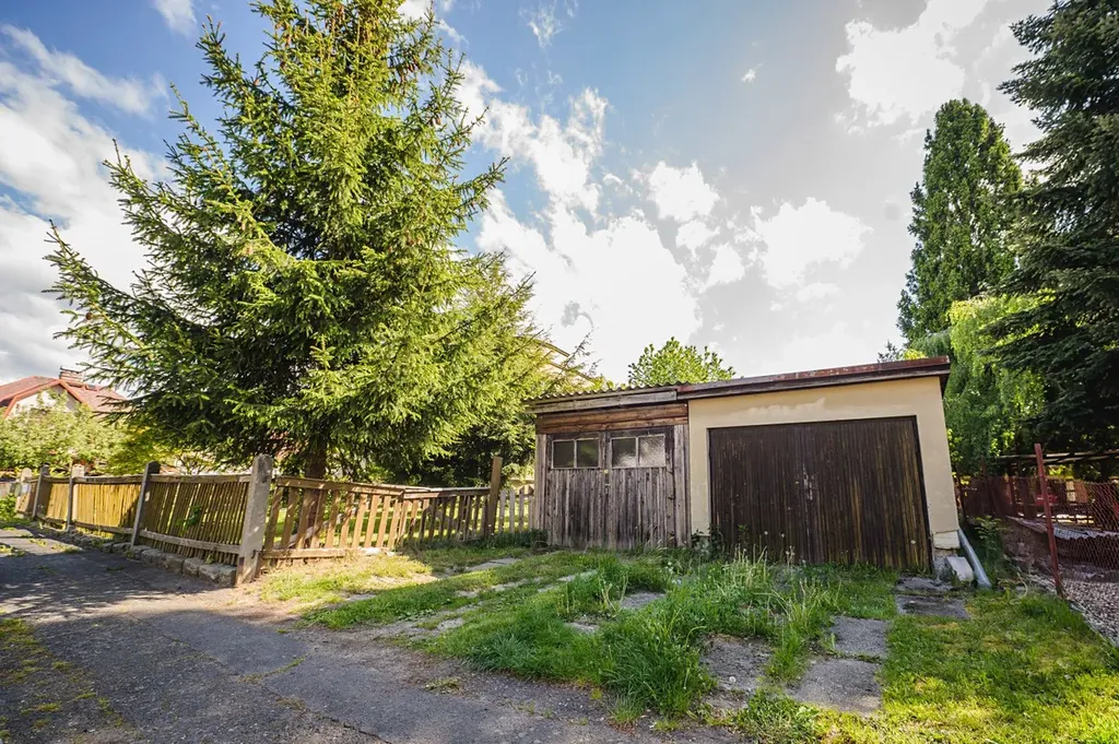 pozemku je garáž s vjezdem z ulice a dřevěnými přístavbami.