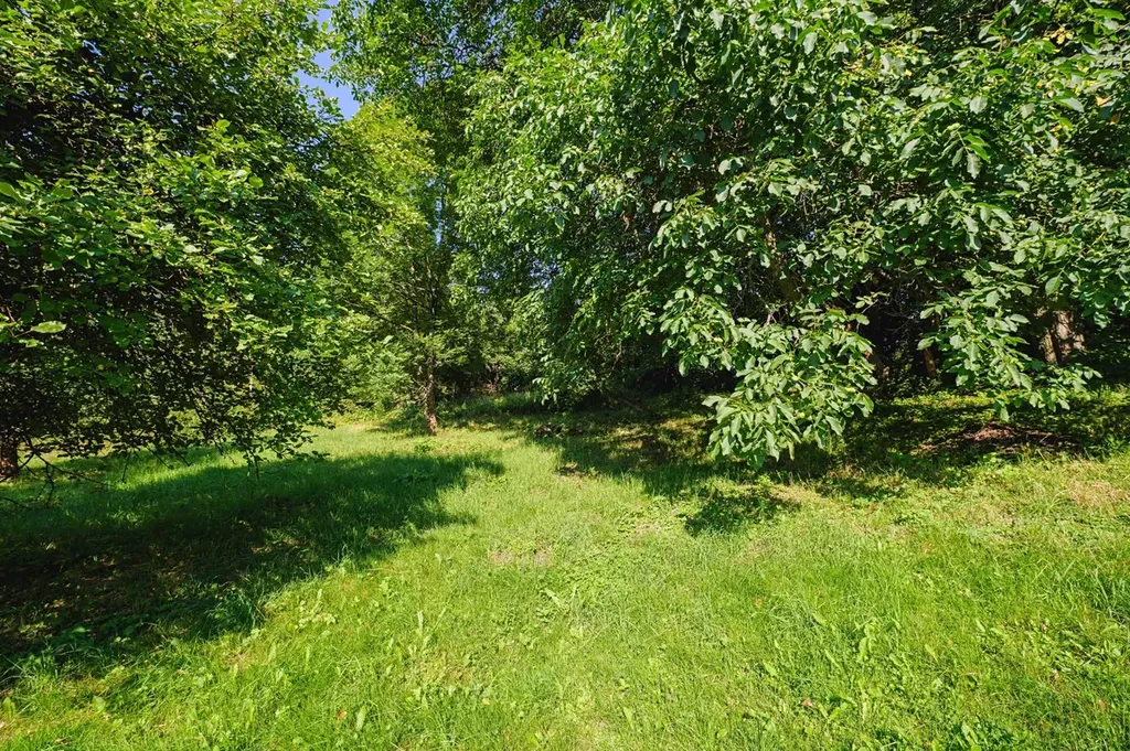 cesta je u pozemku a na hranici pozemku je elektřina. Na pozemku jsou ovocné stromy a i