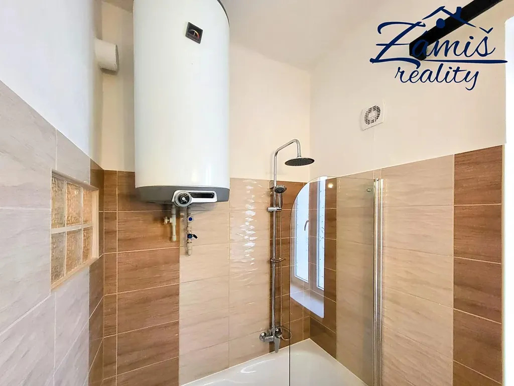 V bytě je zcelá nová koupelna s keramickými obklady a dlažbou. Je vybavena vanou se sprchovou zástěnou, umyvadlem se zrcadlem a místem pro pračku.