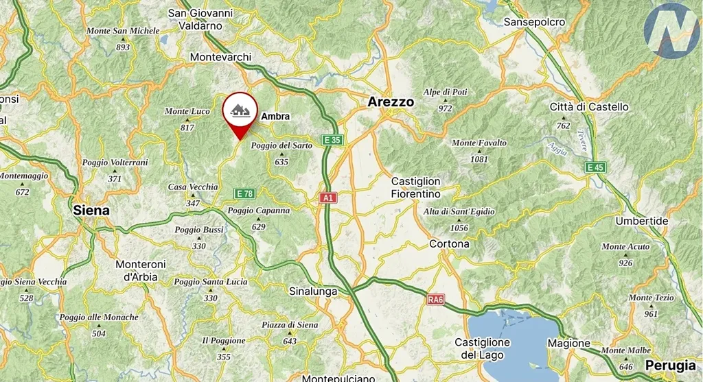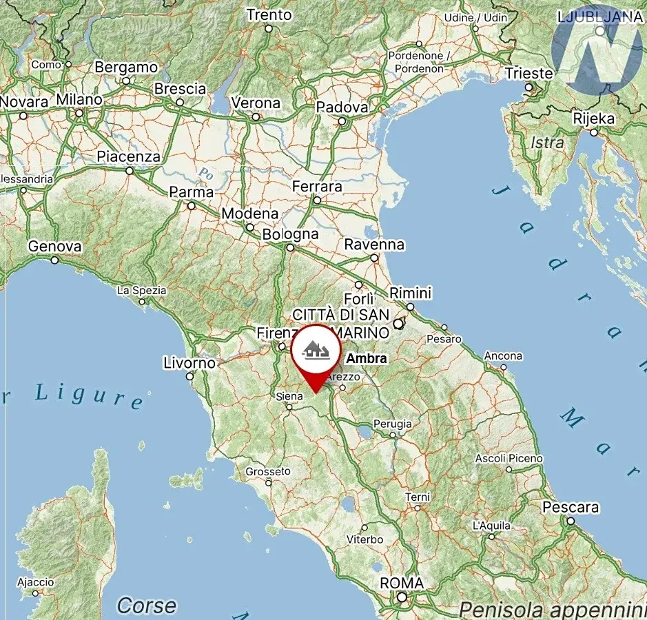 Údolí Valdambra, kde se dům nachází, je jedním z nejautentičtějších koutů Toskánska. Je to krajina olivových hájů, vinic a středověkých vesniček. Ambra je proslulá svými trhy, lokální kuchyní a skvělým vínem z okolních vinic.