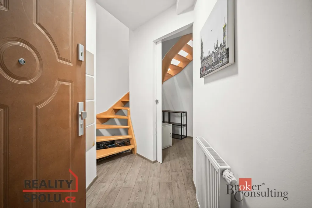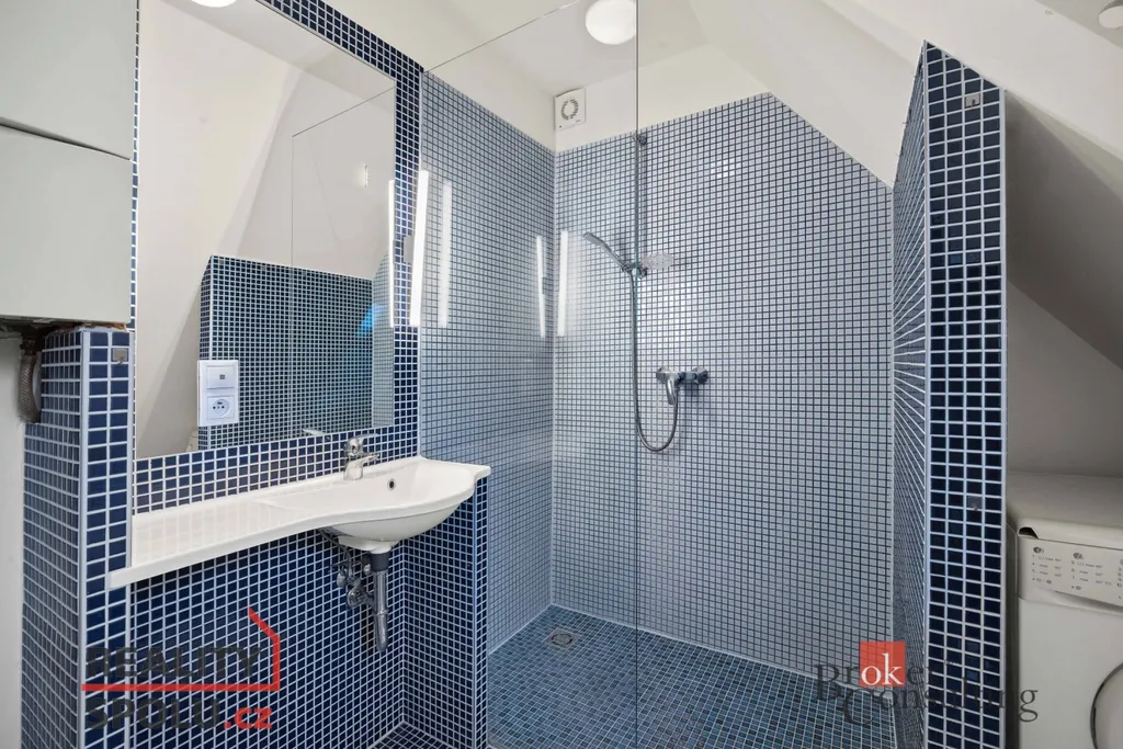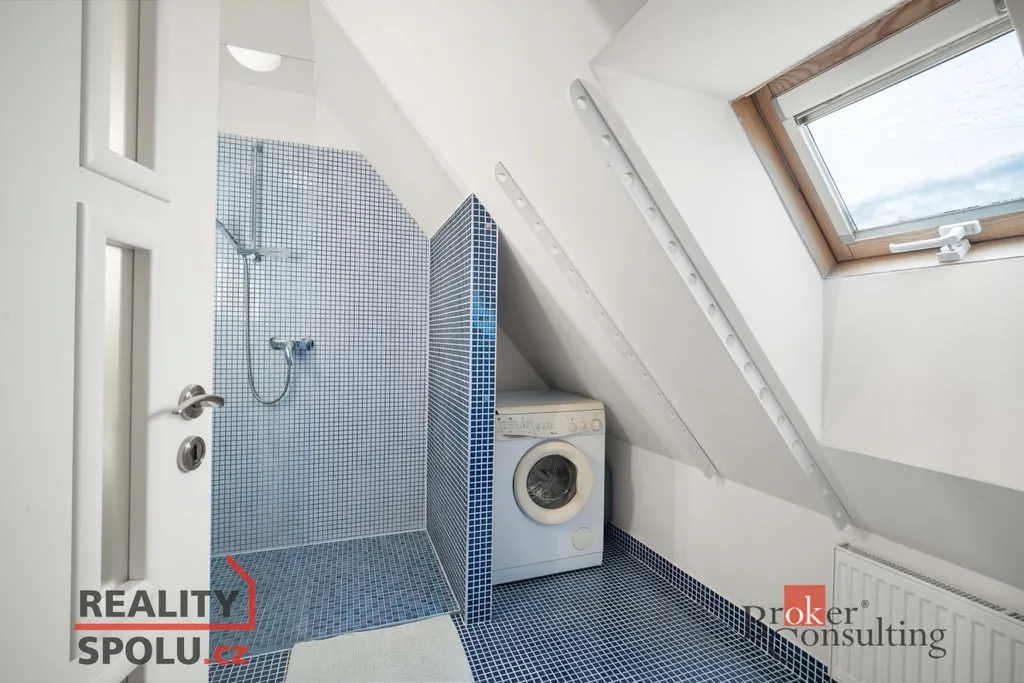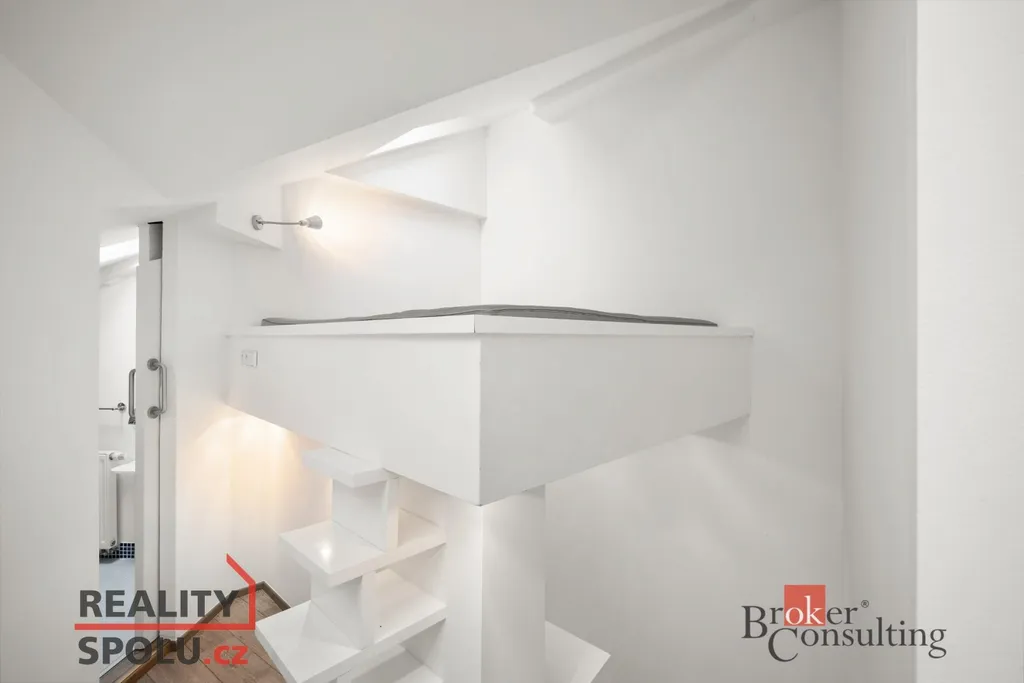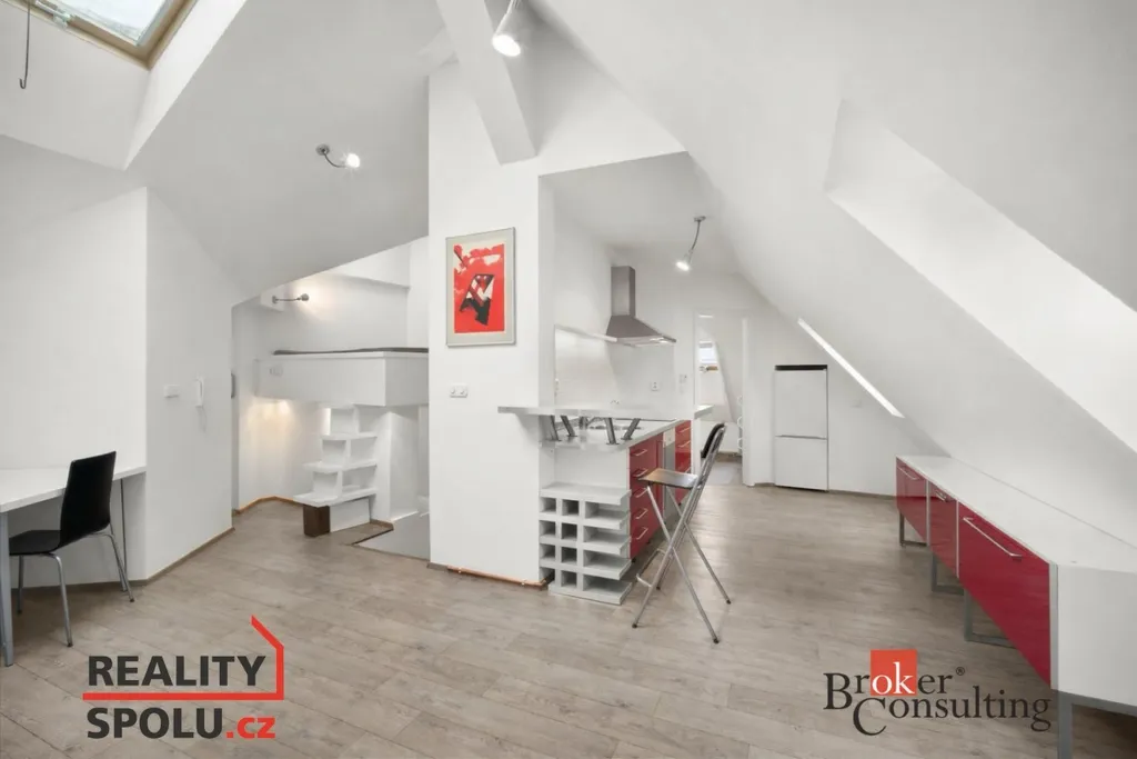 Dominantou bytu je velký obývací pokoj s kuchyňským koutem, ve kterém se nachází vyvýšená postel s výhledem na nebe, dále prostorné zákoutí pro odkládání věcí. Byt nabízí také koupelnu se sprchovým koutem, samostatné WC a praktický prostor pod schody, který lze využít jako šatnu či úložný prostor.