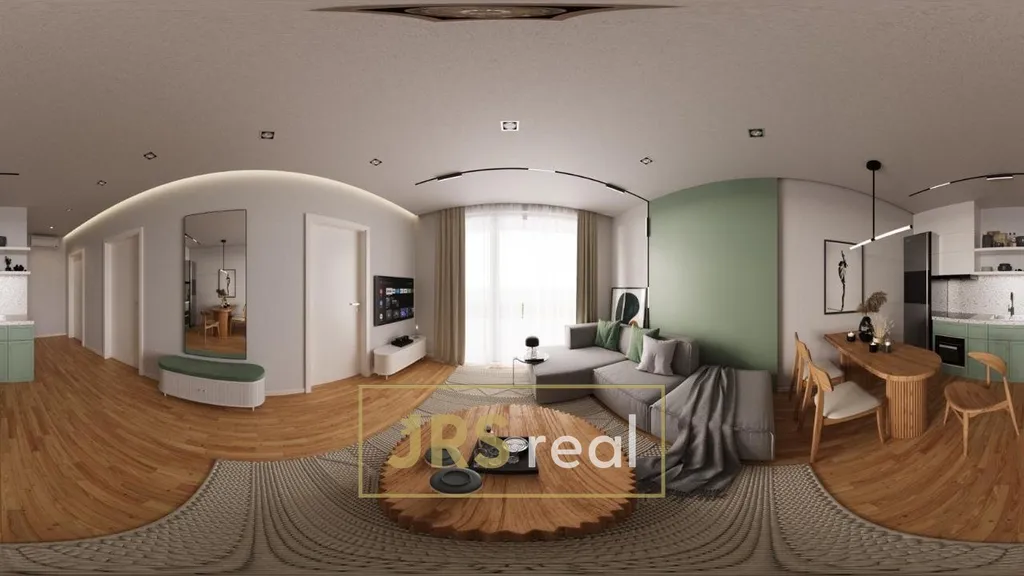 Apartmán se skládá z obývacího pokoje s kuchyňským koutem, dvou samostatných ložnic, koupelny s WC a velmi prostorné terasy s přímým vstupem do zeleně.