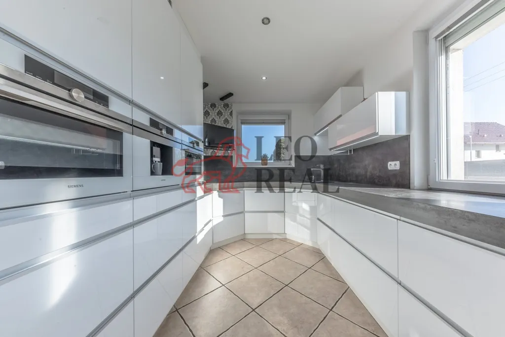 Kuchyně je plně vybavena nejmodernějšími spotřebiči značky Siemens, včetně indukční varné desky, vestavné trouby, myčky nádobí a lednice. Kuchyňská linka je vyrobena z kvalitních materiálů a nabízí dostatek úložného prostoru.