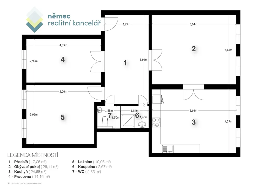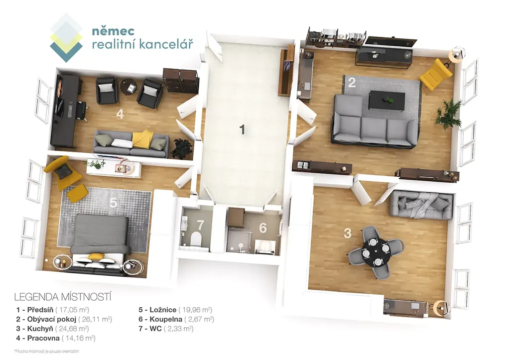 Za vstupem do bytu je umístěna prostorná centrální předsíň (17,05 m²), z které je přístup do všech částí bytové jednotky. Doleva vstoupíte do obývacího pokoje (26,11 m²), na nějž navazuje velká kuchyň s jídelnou (24,68 m²). Doprava z chodby je pak vstup do samostatné ložnice (19,96 m²) a do pracovny (14,16 m²). Rovně vkročíte do koupelny se sprchovým koutem (2,67 m²) a nebo na vedlejší toaletu (2,33 m²) se závěsným wc, umývátkem a praktickými posuvnými dveřmi, které ukrývají technologii - plynový kotel.