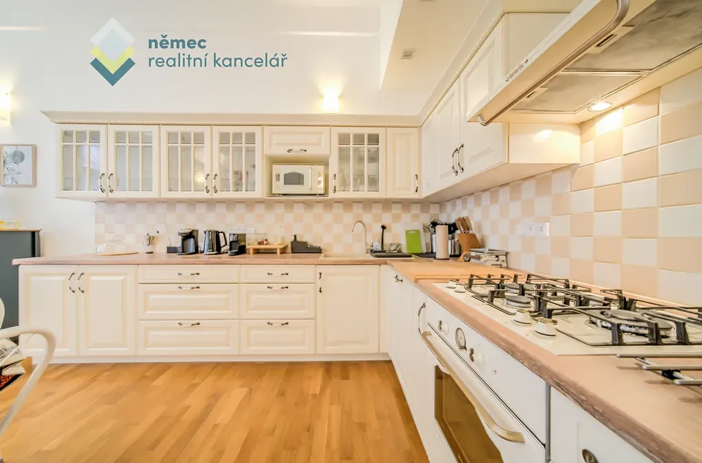 I přes dobové doplňky se ale jedná o kompletně zrekonstruovaný byt s masivní kuchyňskou linkou včetně spotřebičů (plynová varná deska, digestoř, horkovzdušná trouba, myčka, vestavná kombinovaná lednice s mrazákem, zabudovaná pračka), kompletním zařízením - sedací soupravou, tv stolkem a tv, knihovnami, pohovkou, jídelním stolem se židlemi, dvojlůžkem s matracemi a roštem, velkou zrcadlovou šatní skříní, komodami a nočními stolky, křesly a psacím stolem, rustikálními stojacími lampami.