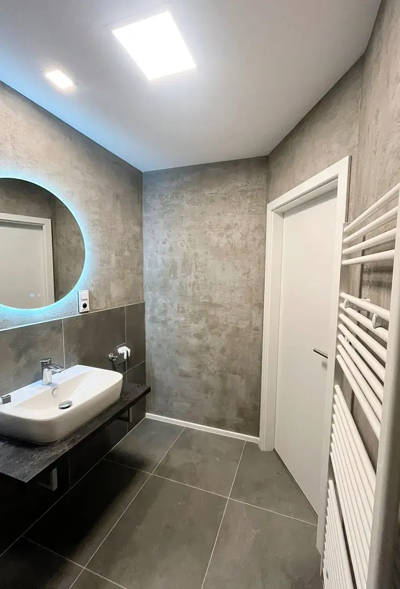 Koupelna (4 m²) má prostorný sprchový kout, umyvadlo, zrcadlo s podsvícením, otopný žebřík a přípojku na pračku/ sušku.