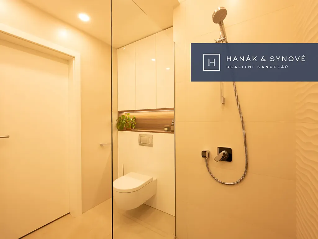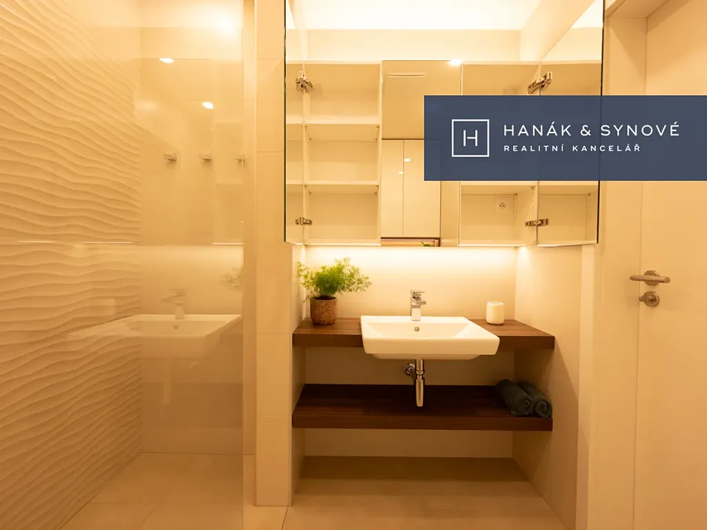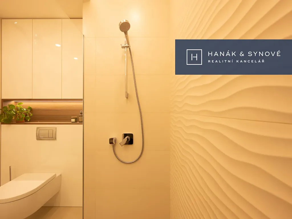 Byt je zařízený ve vysokém standardu a je nabízen částečně zařízený – kuchyňská linka se spotřebiči (varná deska, trouba, vestavěná lednice s mrazákem, pračka a sušička), vestavěná skříň, venkovní žaluzie. Koupelna je vybavena walk-in sprchovým koutem se skleněnou zástěnou značky HÜPPE, záchodem a umyvadlem s umyvadlovou skříňkou, podsvíceným zrcadlem.
