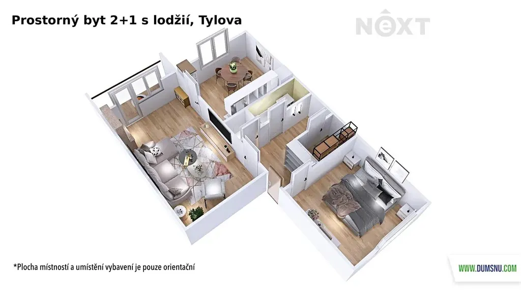 Dispozice bytu zahrnuje vstupní chodbu s praktickou komorou, ložnici, obývací pokoj se vstupem na lodžii, samostatnou kuchyni, menší koupelnu s vanou a oddělenou toaletu. Díky tomuto uspořádání nabízí byt dostatek úložného prostoru i komfortní bydlení.