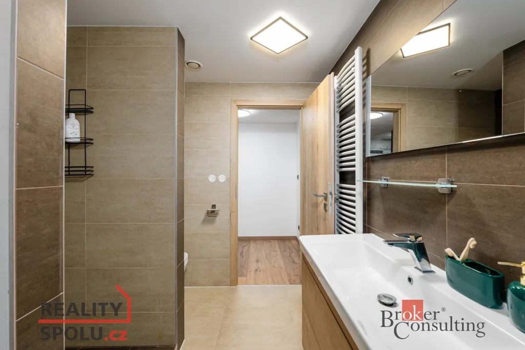 V dolním patře bytu se nachází koupelna se sprchovým koutem, toaletou a umyvadlem, samostatný pokoj aktuálně využívaný jako šatna a především dominantní obývací část s plně vybaveným kuchyňským koutem.