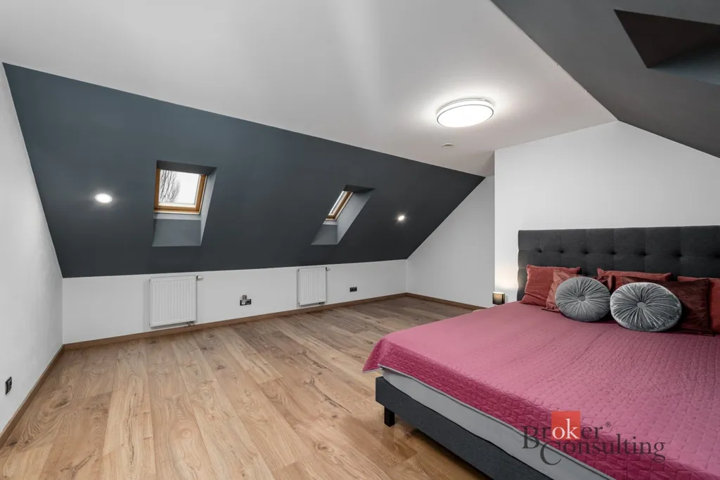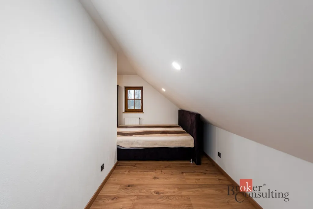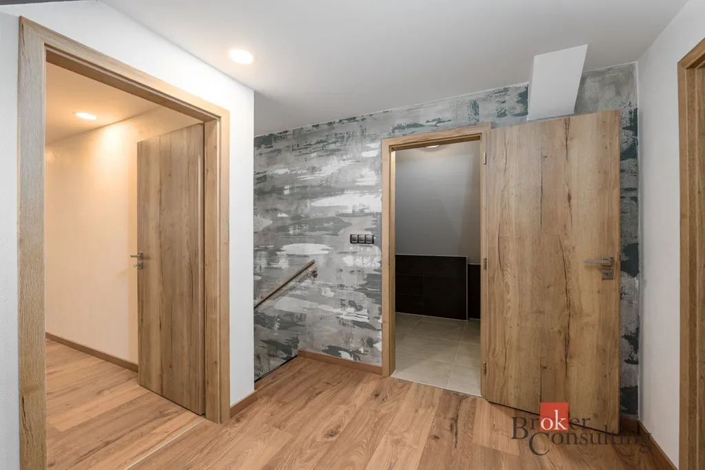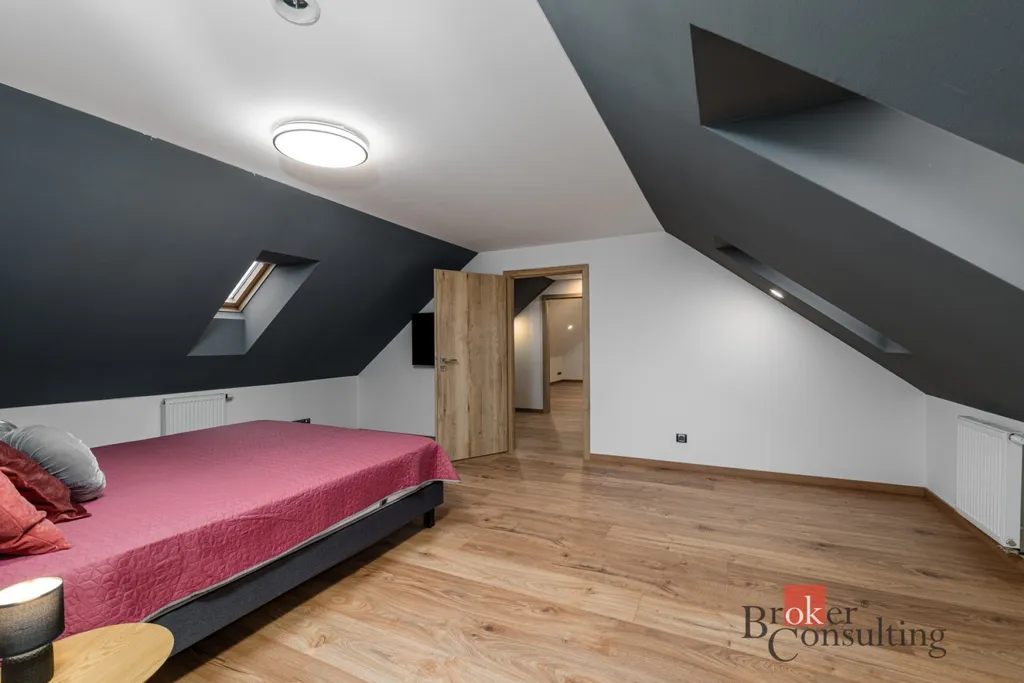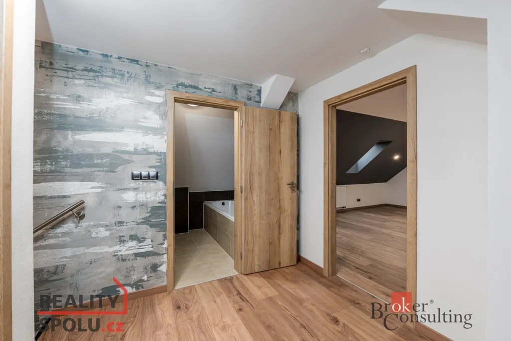 Po schodišti se dostanete do horního patra, kde vás přivítá prostorná chodba vedoucí do atypického pokoje ve tvaru U. Tento velkorysý prostor nabízí ideální využití jako obří dětský pokoj s hernou nebo reprezentativní pracovna. Další možné využití ponecháváme již na vás – zde se meze skutečně nekladou. Dále zde naleznete druhou koupelnu s vanou, umyvadlem a toaletou a také hlavní ložnici s dostatkem soukromí.