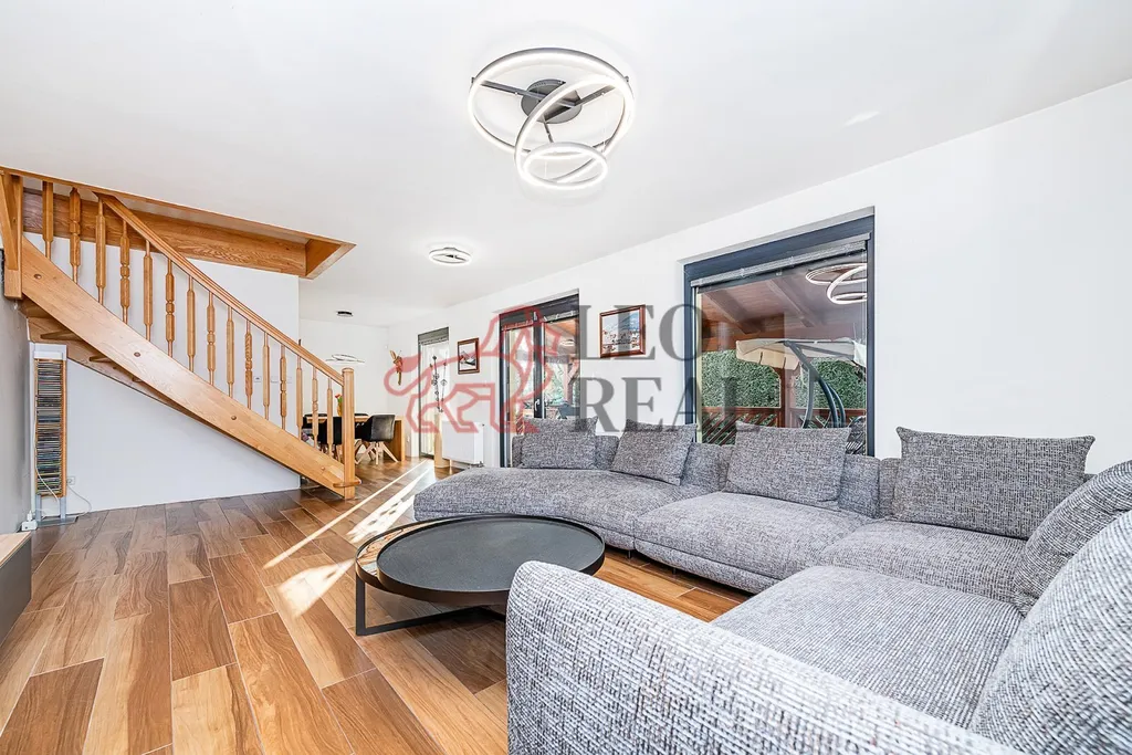 • Přízemí: Srdcem domu je obývací pokoj (26,7 m²) propojený s kuchyní (15 m²) a jídelnou, kde dominuje masivní dubový stůl. Odtud vede vstup na zastřešenou terasu, která plynule propojuje dům se zahradou a nabízí soukromí pro relaxaci za každého počasí. Dále se v přízemí nachází pracovna s vestavěnou knihovnou (ideální pro home office), koupelna se sprchovým koutem, pračkou a sušičkou, spíž a garáž (19,45 m²).