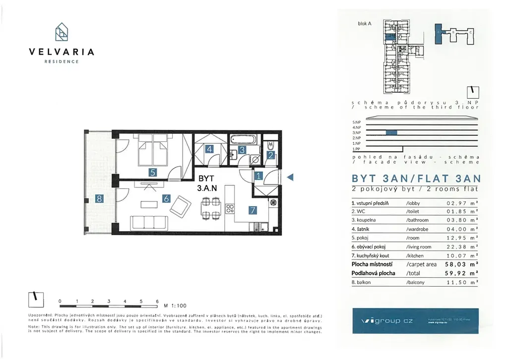 Nabízíme k dlouhodobému pronájmu částečně zařízený byt s dispozicí 2+kk o velikosti 60m2, s prostorným balkonem 12m2 a krytým garážovým stáním v moderním projektu Velvaria Residence, Horoměřice – Praha západ, nedaleko Prahy 6.